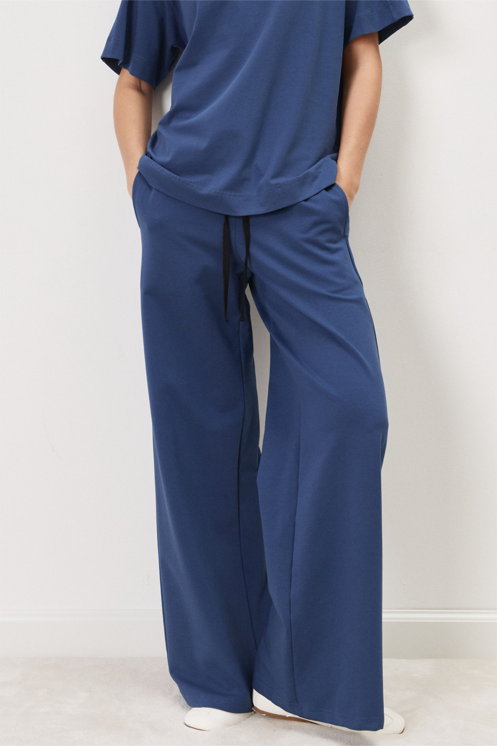 Широкие брюки прямого силуэта на мягком эластичном поясе и регулировочным шнуром. Выполнены из мягкого футера, который отличается износостойкостью и приятными тактильными ощущениями.