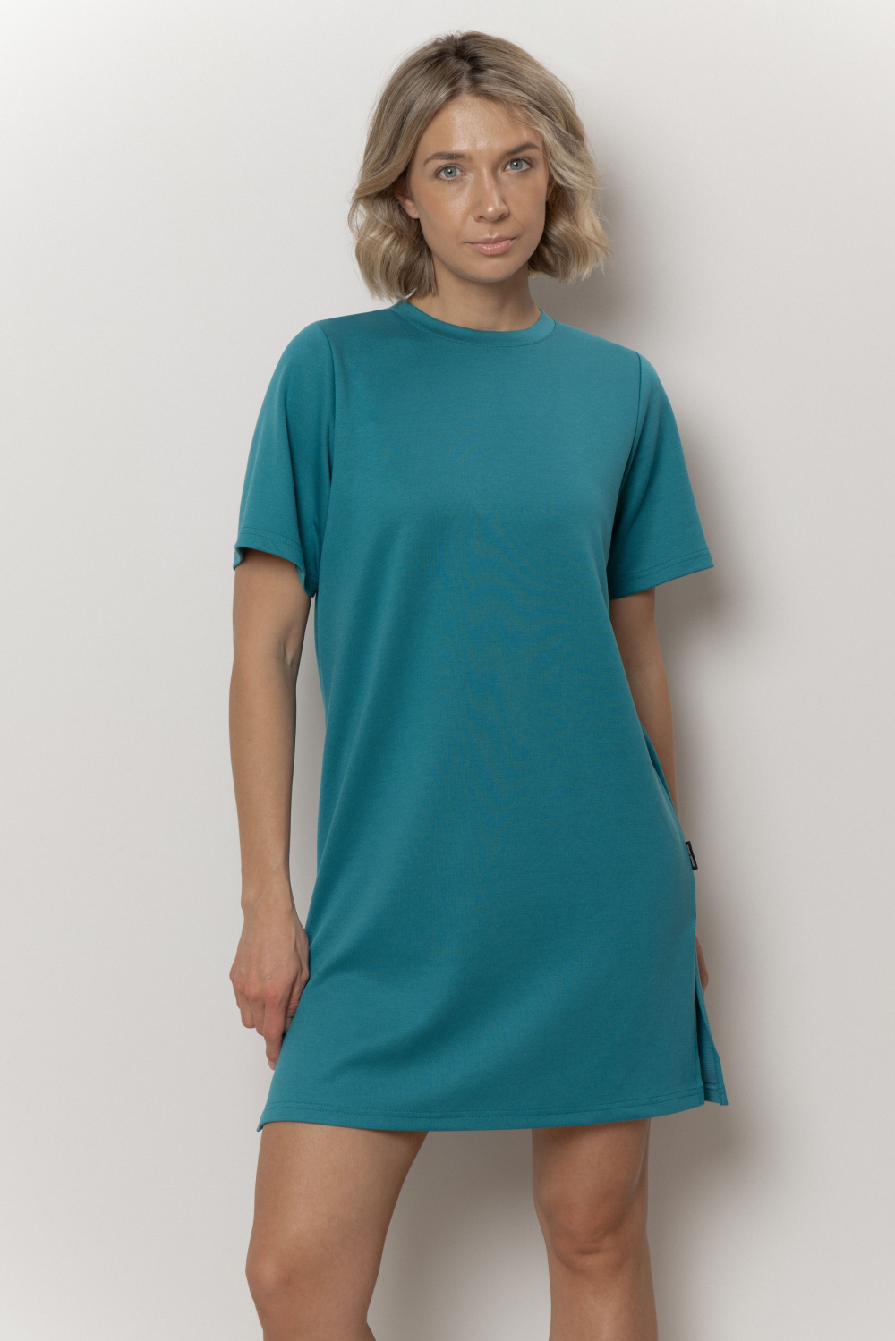 Женское платье-футболка свободного, прямого силуэта с лаконичным круглым вырезом горловины и коротким рукавом.