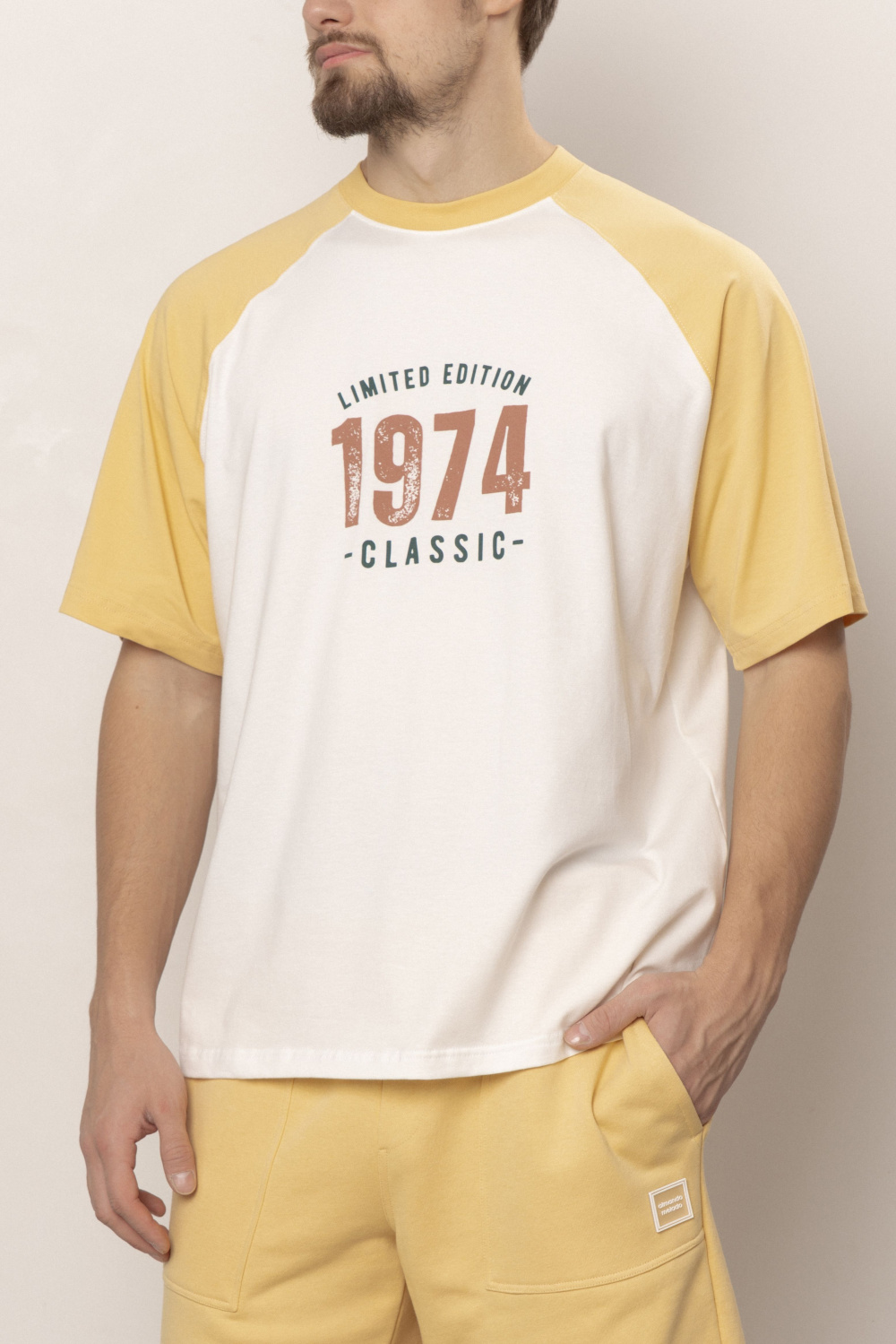 Футболка прямого силуэта с круглым вырезом и втачным акцентным рукавом, декорированным тематическим принтом. Плотная кулирная гладь из натурального хлопка с добавлением эластана