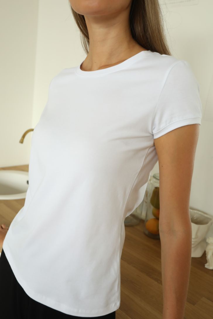 Футболка свободного прилегания с круглым вырезом горловины и коротким классическим рукавом. Удачно комбинируется с брюками и шортами базовой коллекции, а так же с любыми поясными изделиями из личного гардероба. Идеально сочетается с жакетами и кардиганами.