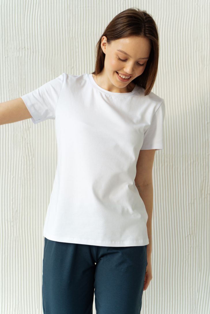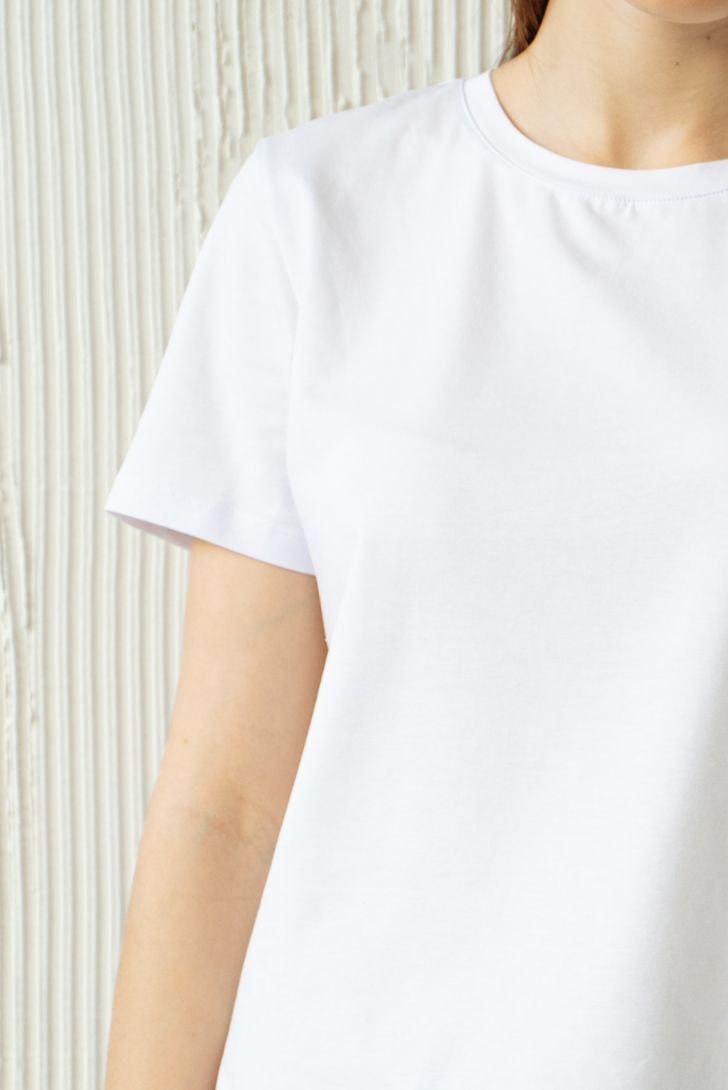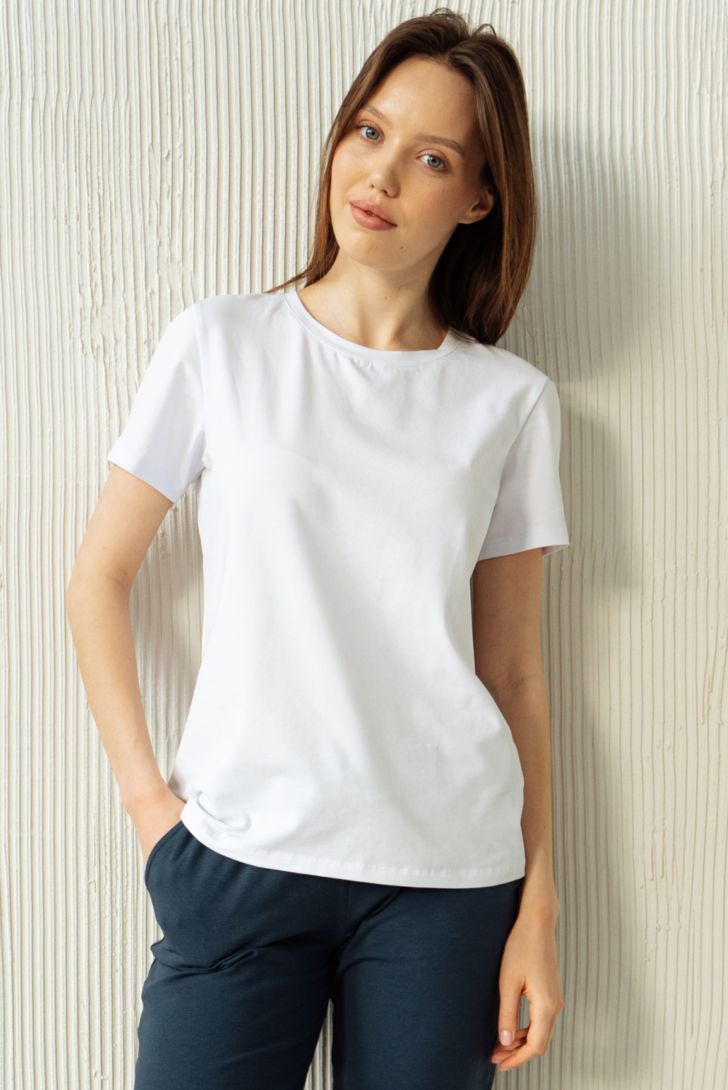 Футболка свободного прилегания с круглым вырезом горловины и коротким классическим рукавом. Удачно комбинируется с брюками и шортами данной коллекции, а так же с любыми поясными изделиями из личного гардероба. Идеально сочетается с жакетами и кардиганами.