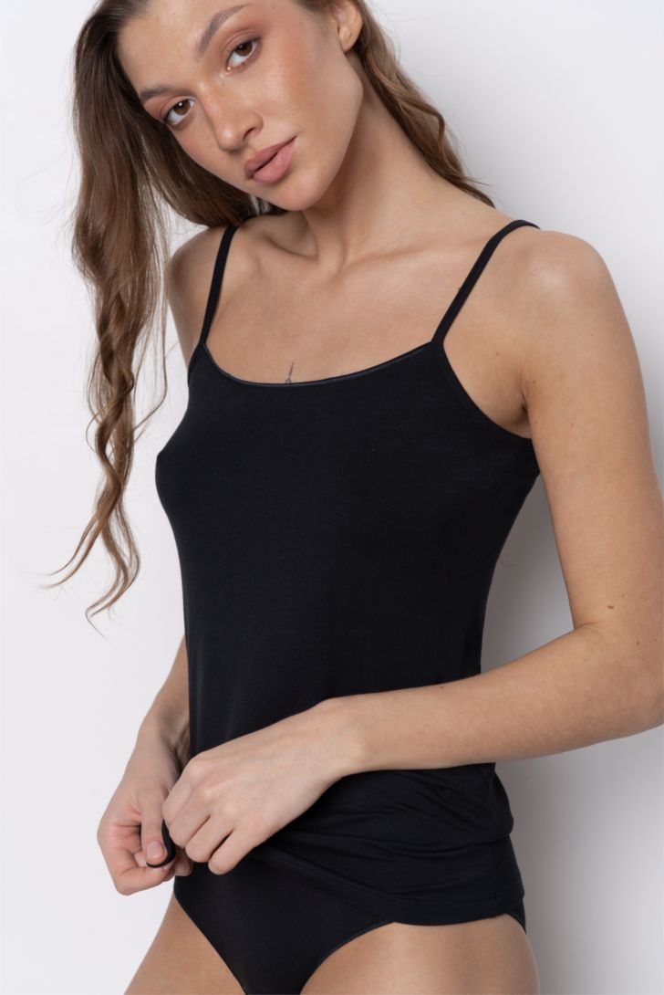 Нежная майка на тонких бретелях изготовлена из микромодала с добавлением эластана. Модель идеально подходит для повседневных и уютных домашних образов.