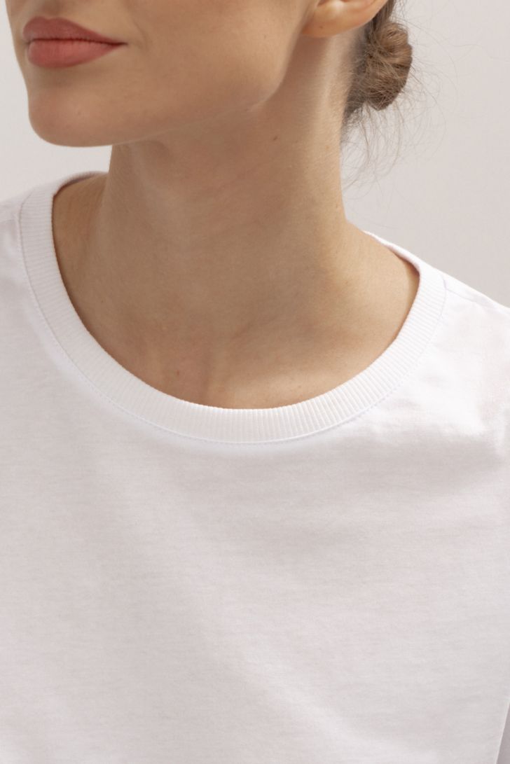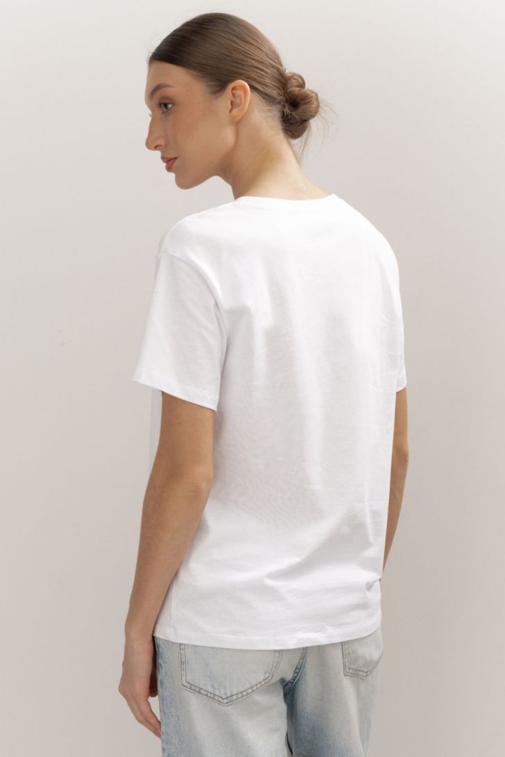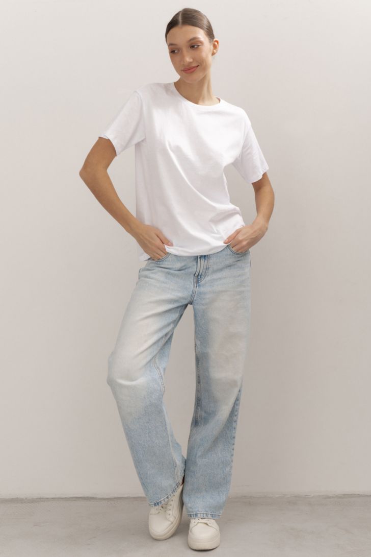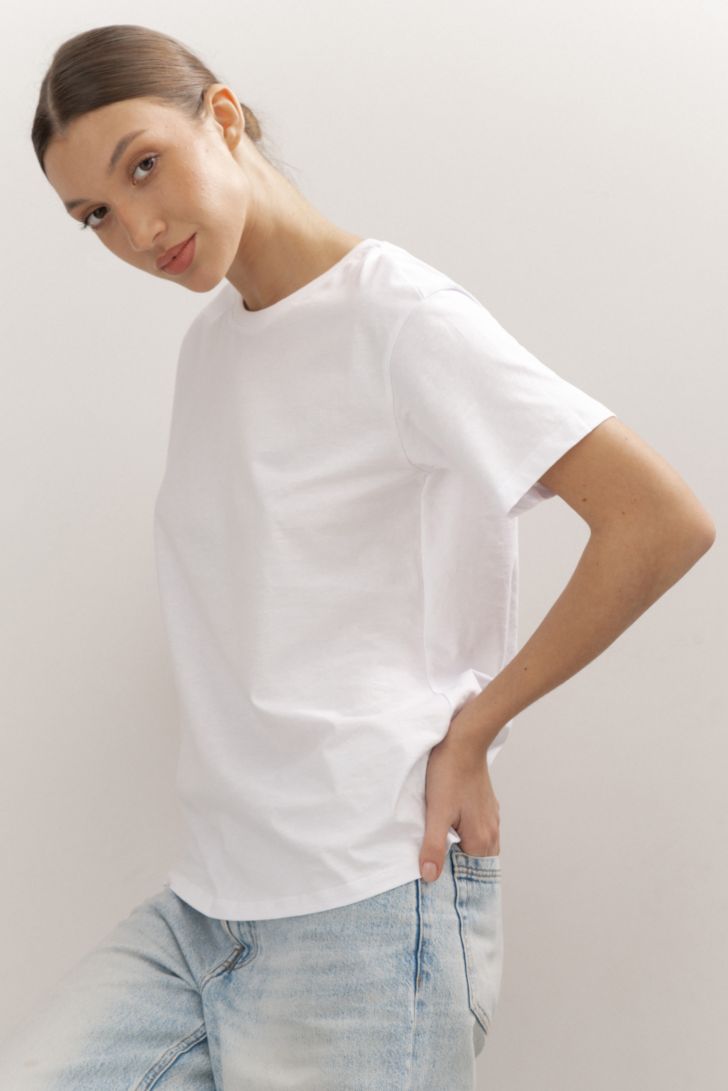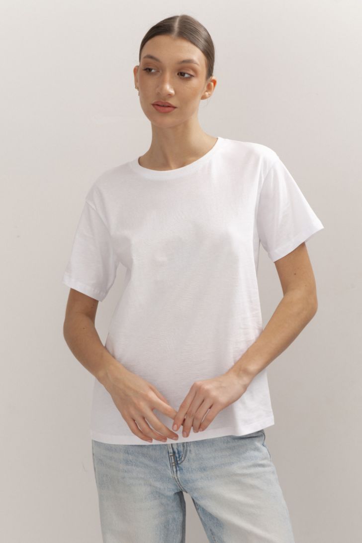 Классическая футболка с короткими рукавами. Вырез горловины круглый. Модель свободного силуэта прямого кроя.