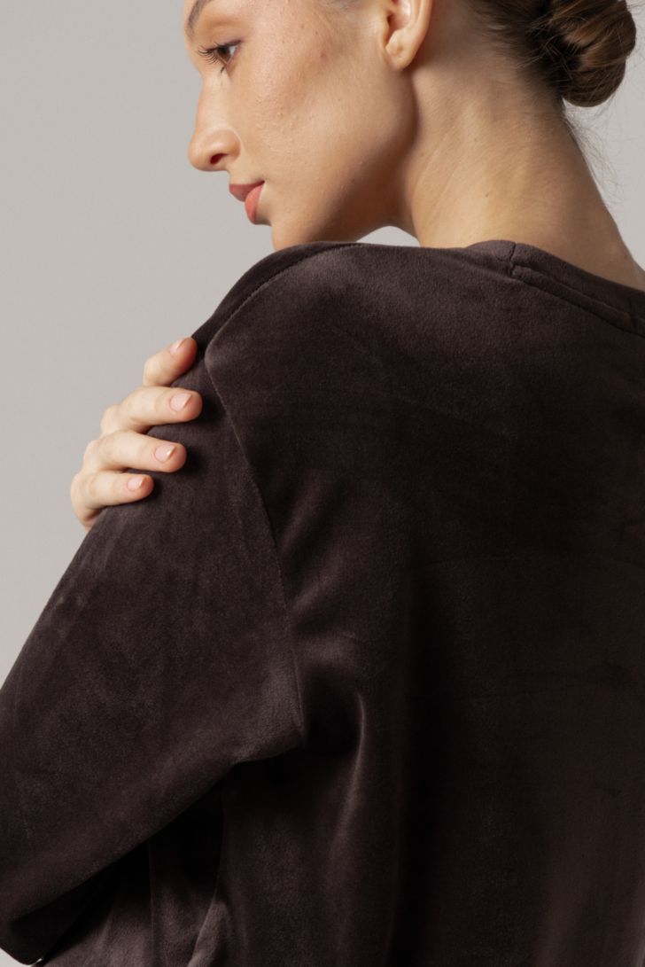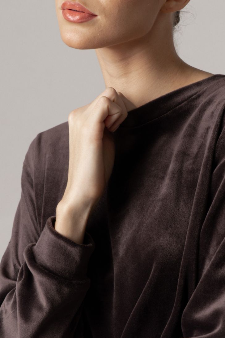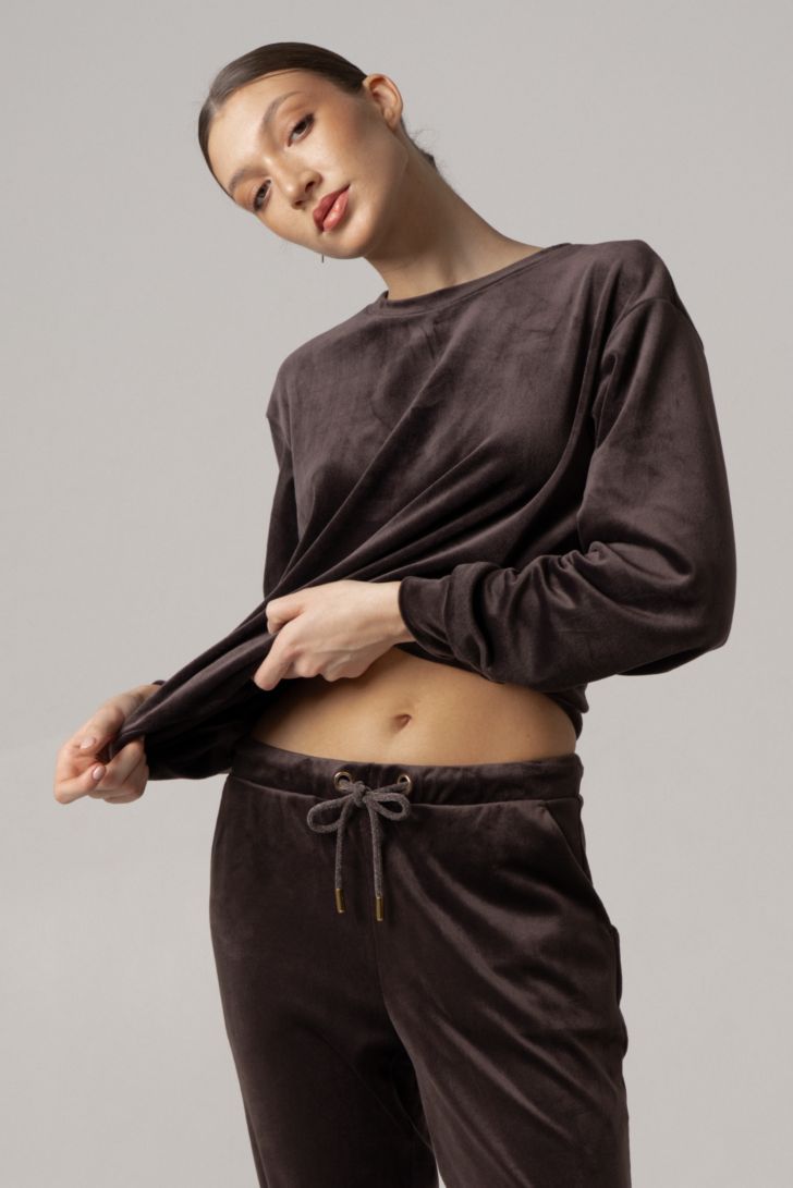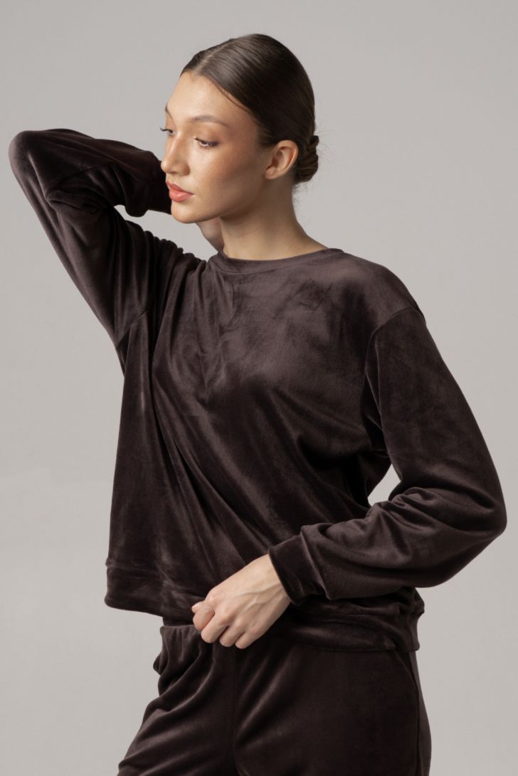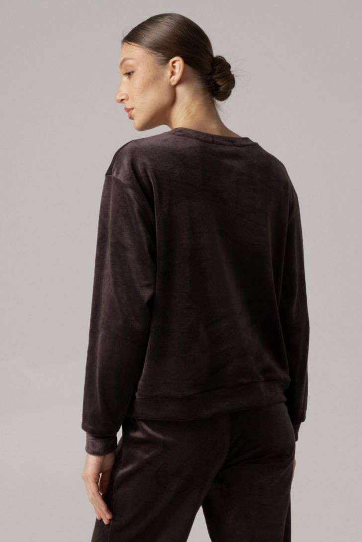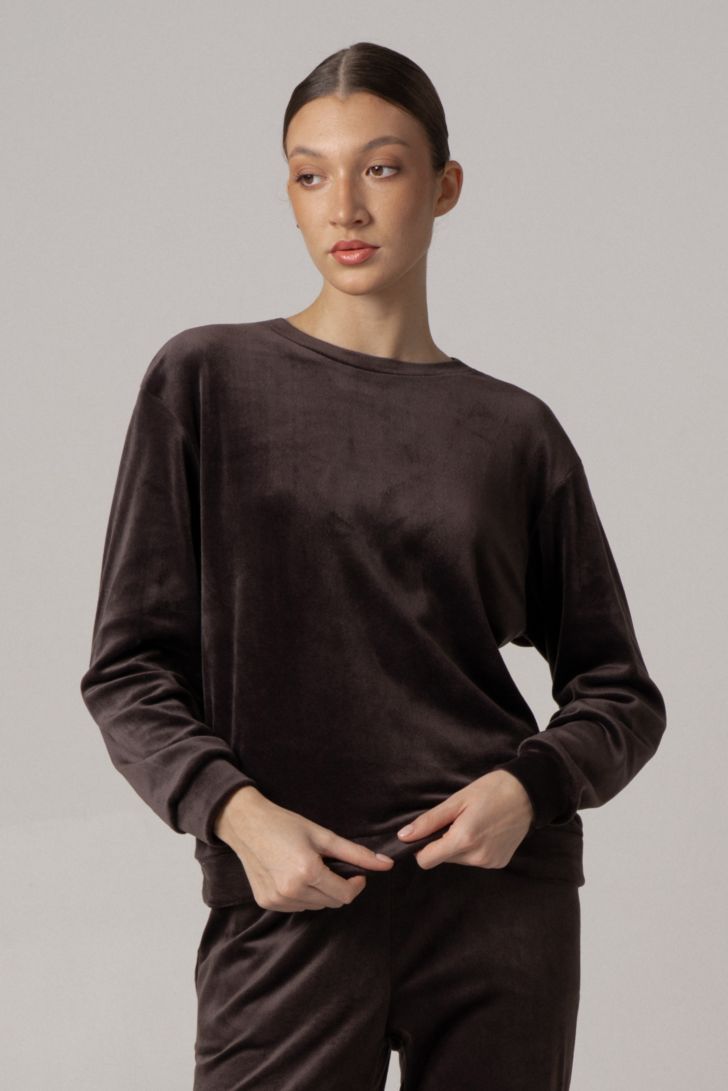 Свитшот свободного прилегания. Вырез горловины круглый. Рукав длинный на манжете из основного полотна. Линия плеча приспущена для большего комфорта. По низу изделия пояс из основного полотна.