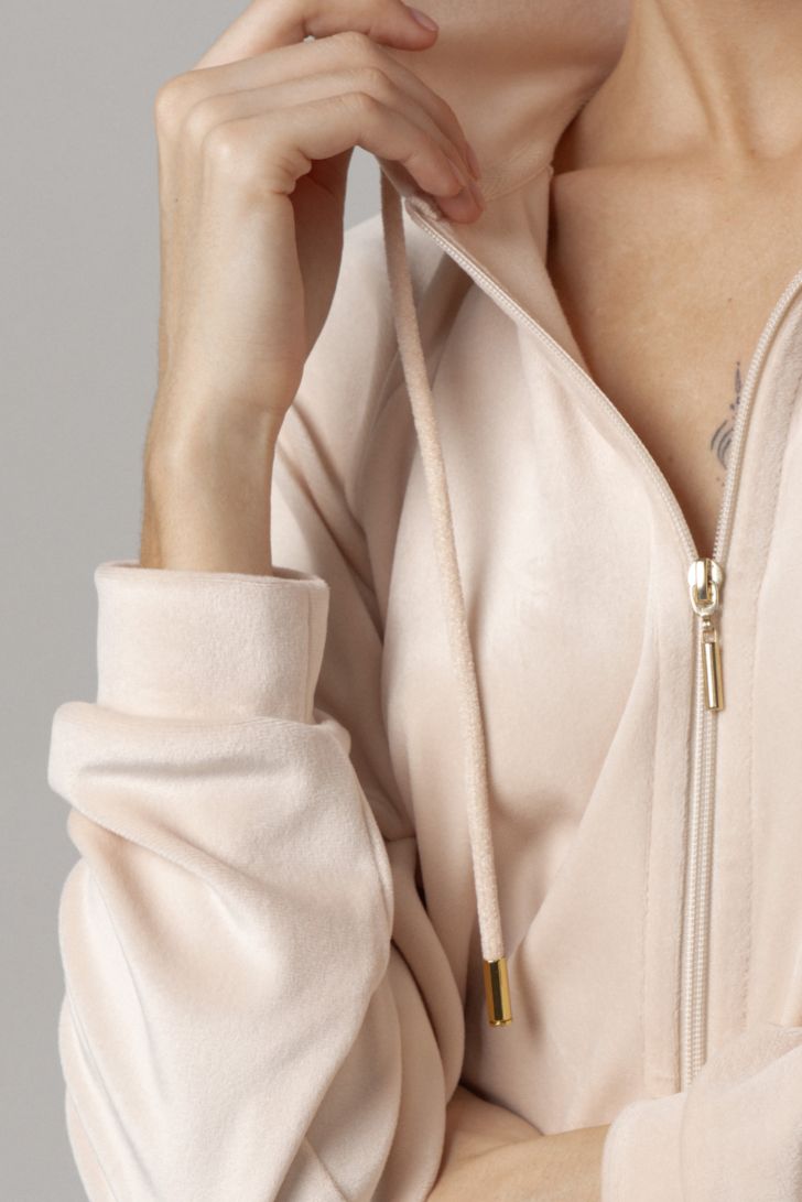 Капюшон комфортного кроя на кулисе из декоративного шнура с металлическими наконечниками. Подклад капюшона выполнен из основного полотна.