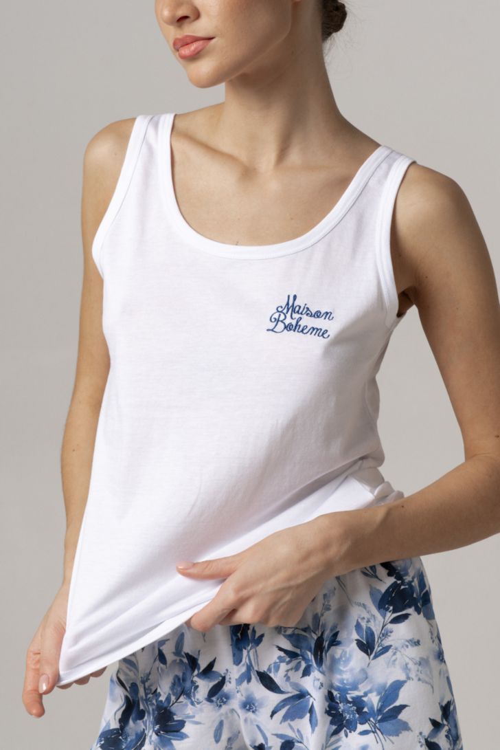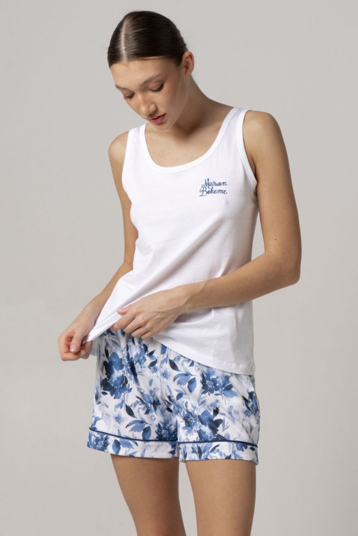 Шорты средней длины с функциональными карманами. В поясе кулиска с контрастной лентой. Пижама представлена в двух цветовых решениях. Топ пижамы декорирован тематическим минималистичным принтом.