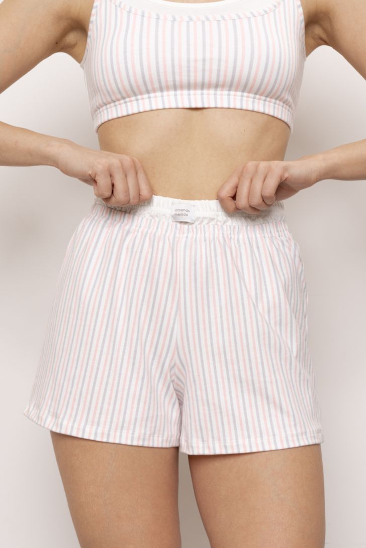 Шорты свободного прилегания на резинке. Многослойный пояс является трендом сезона. Модель декорирована брендовой нашивкой