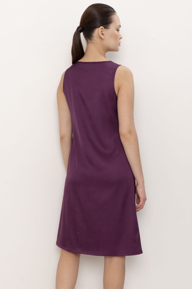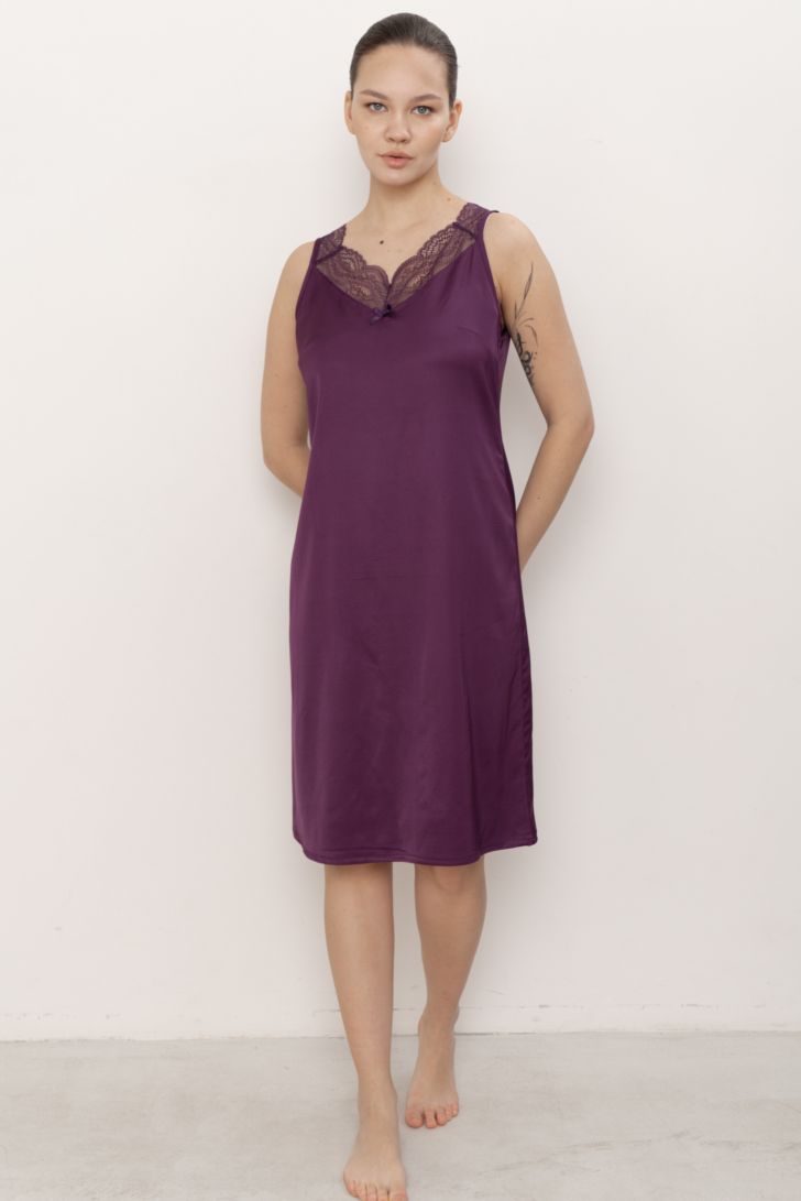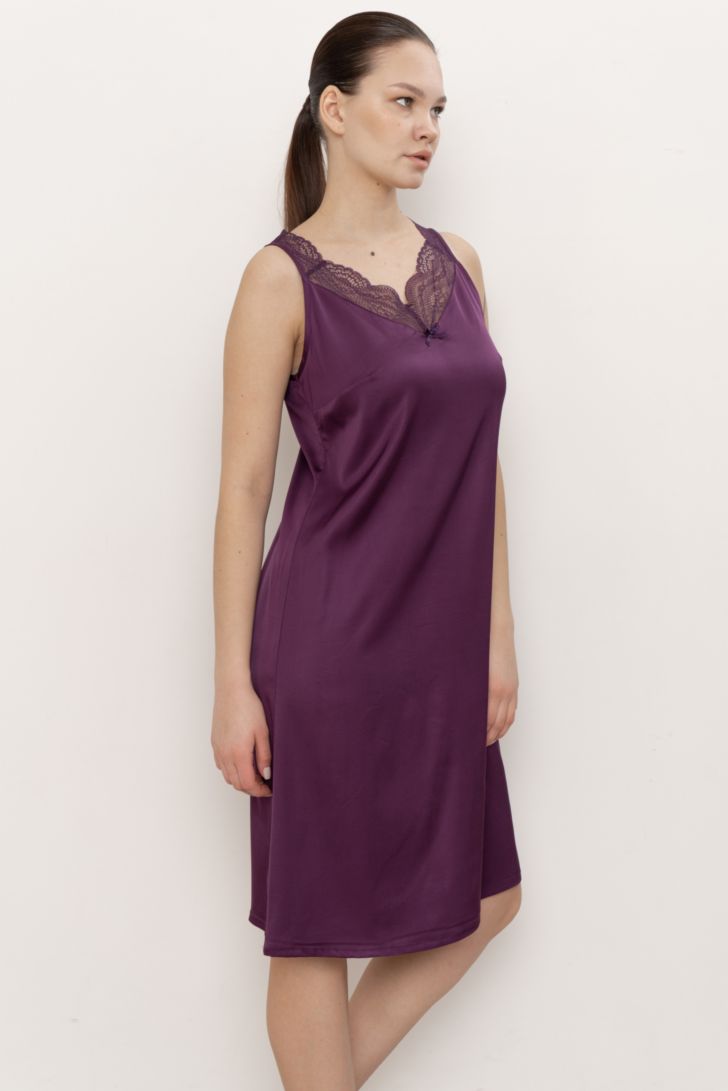V-образный вырез на груди декорирован ажурной кружевной вставкой, придающей образу романтичный стиль. А прямой, классический крой подчеркивают элегантную простоту модели.