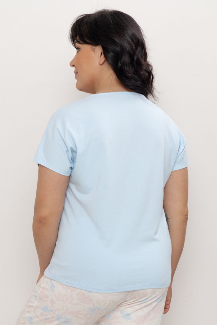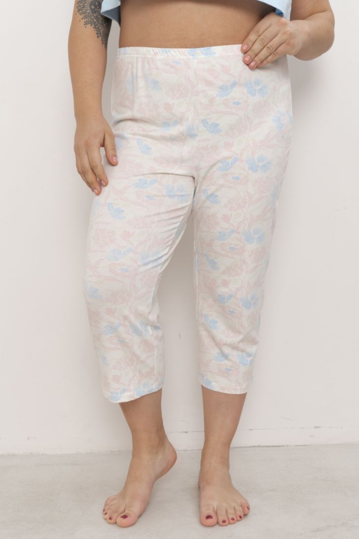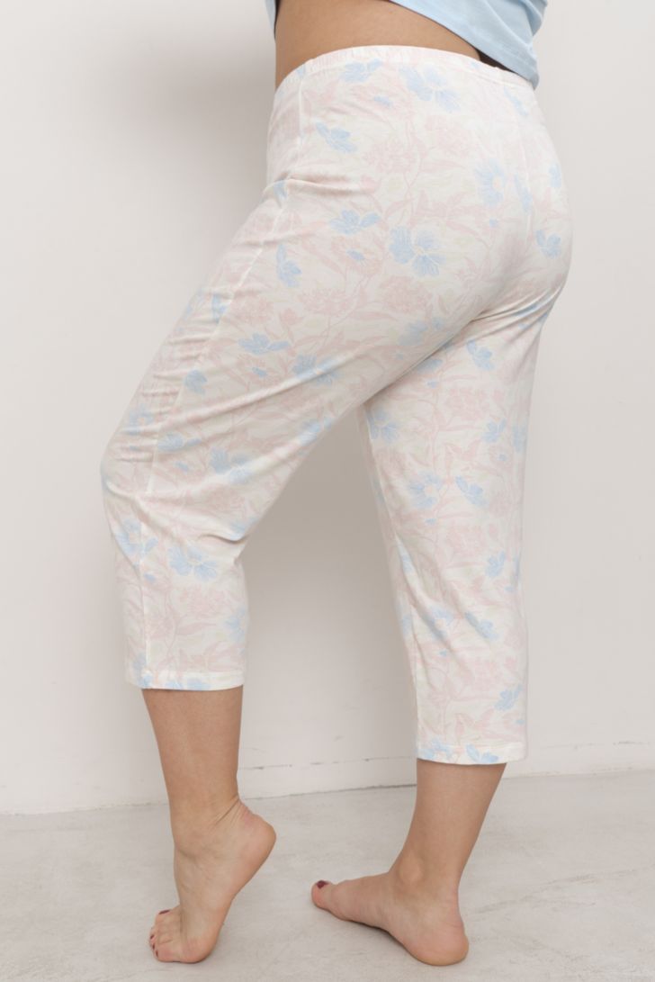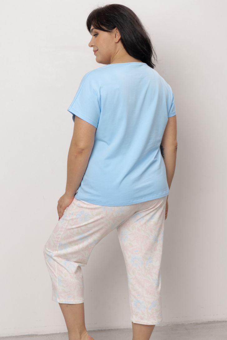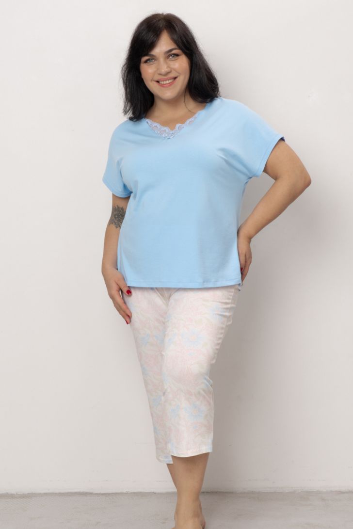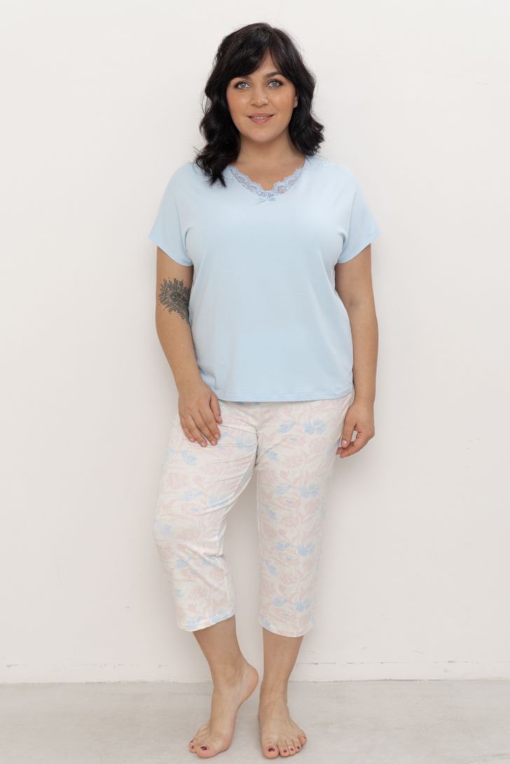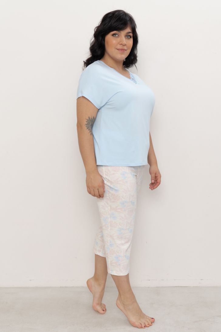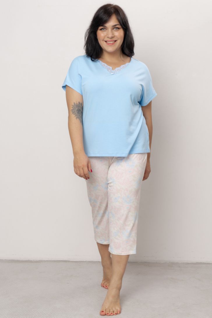 Пижама свободного прилегания состоит из футболки с коротким рукавом и бридж. Вырез горловины футболки круглый. По