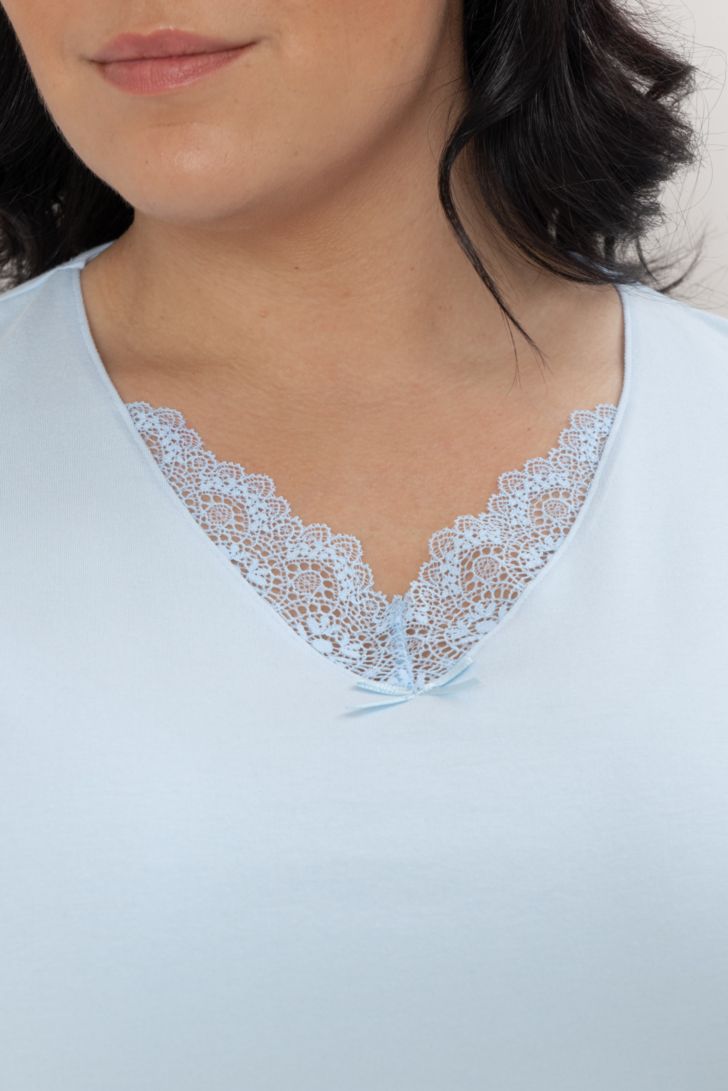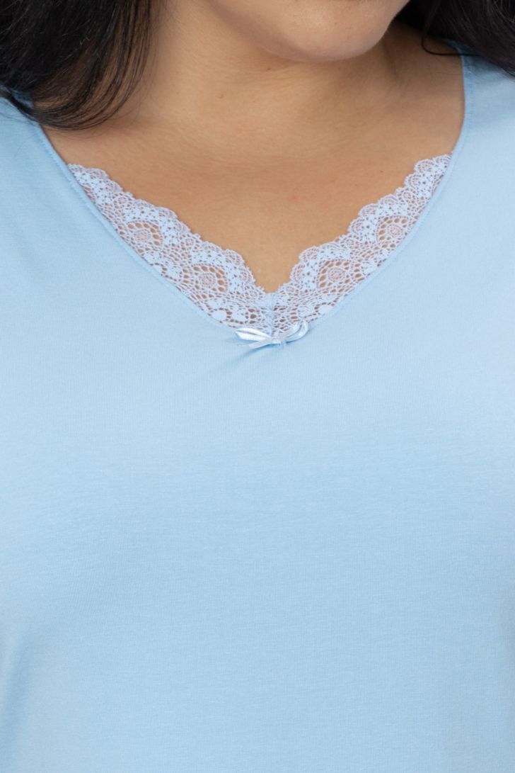 горловине настрочено элегантное кружево и добавлен декорированый атласный бантик. Приспущенная линия плеча придает футболке больший комфорт. Пояс бридж на мягкой резинке.