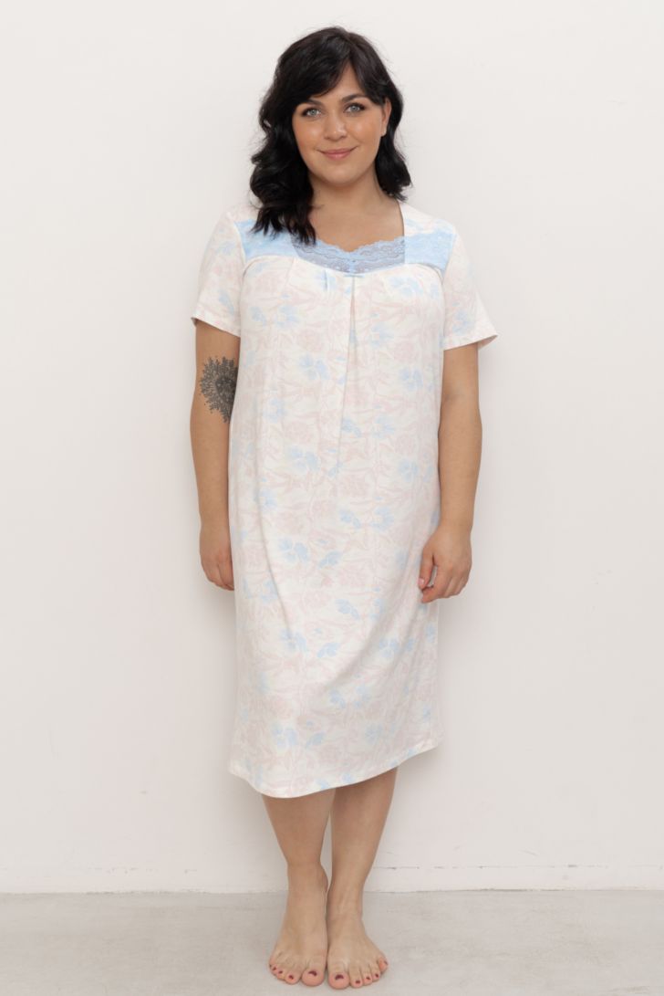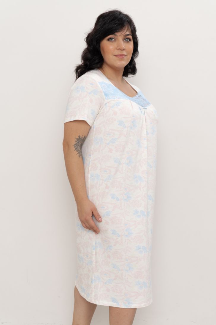 Классическая сорочка свободного прилегания элегантной длины ниже колена с коротким рукавом. Лиф сорочки украшен настроченным