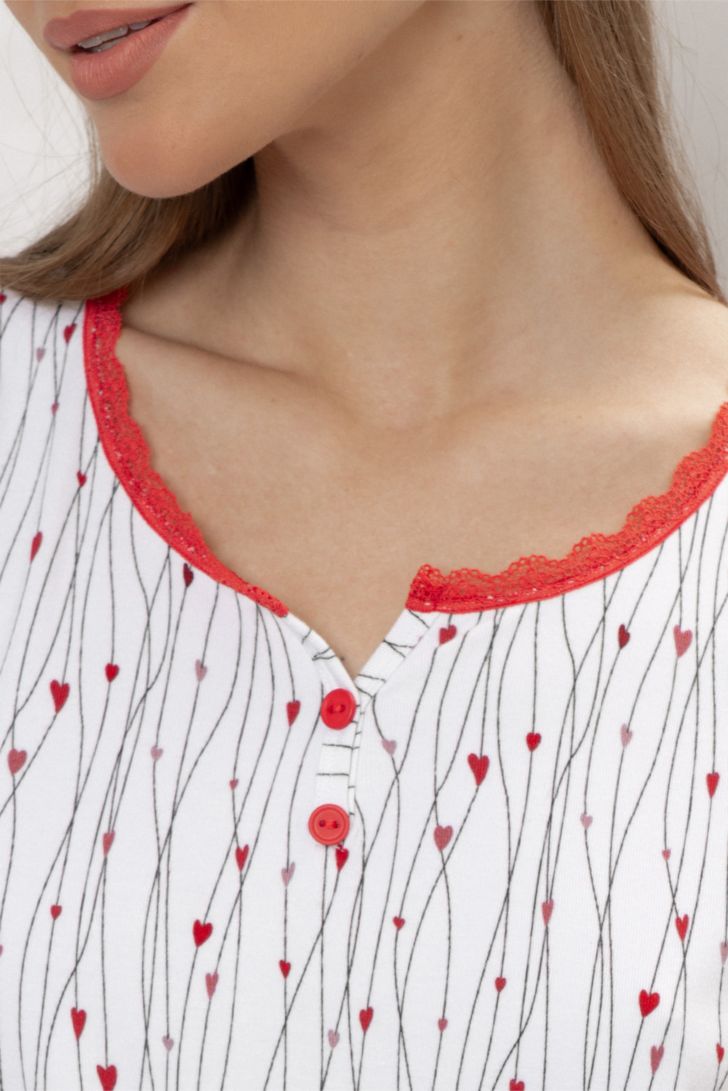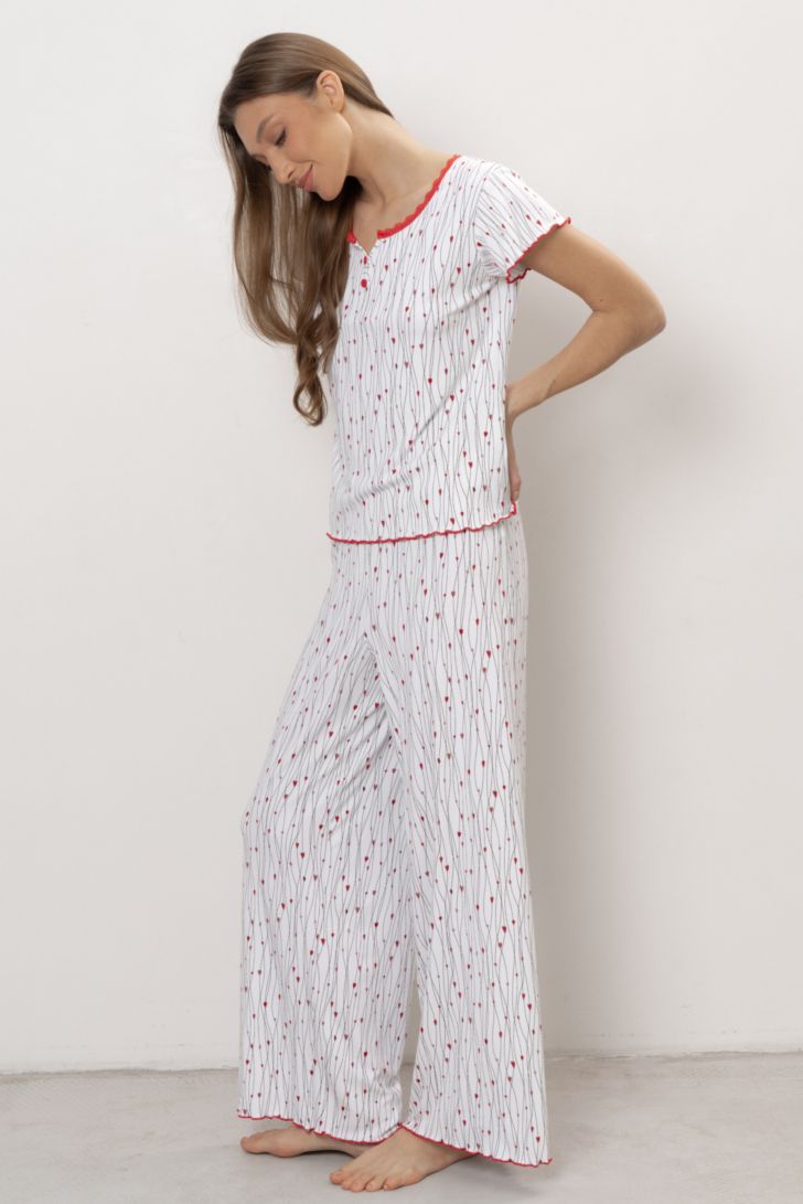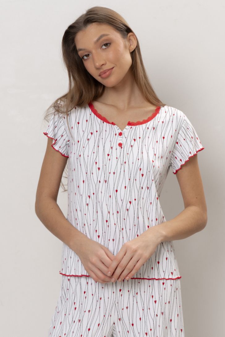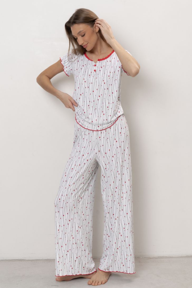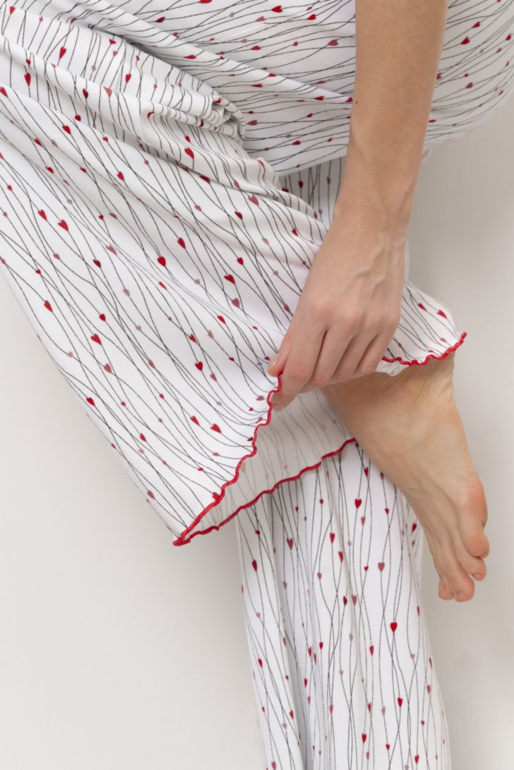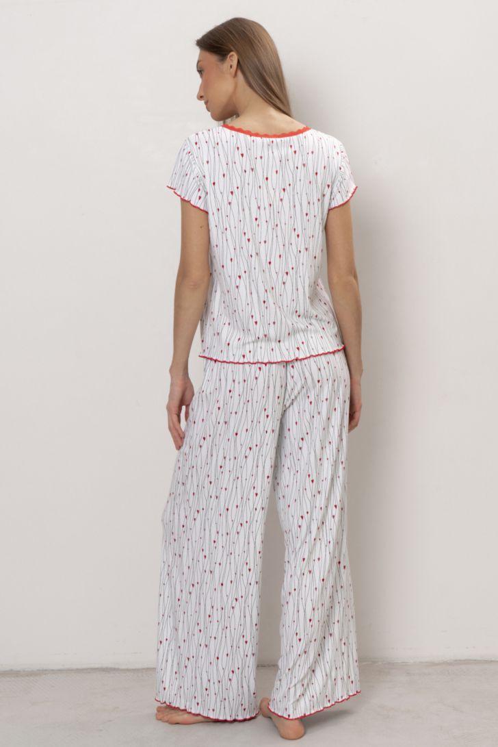 Струящаяся пижама из нежной вискозы состоит из футболки с коротким рукавом и свободных брюк. Пояс струящихся брюк на мягкой резинке. Вырез горловины футболки круглый. Вырез горловины декорирован нежным контрастным кружевом и функциональной планкой, а все срезы пижамы игривой отстроцкой.