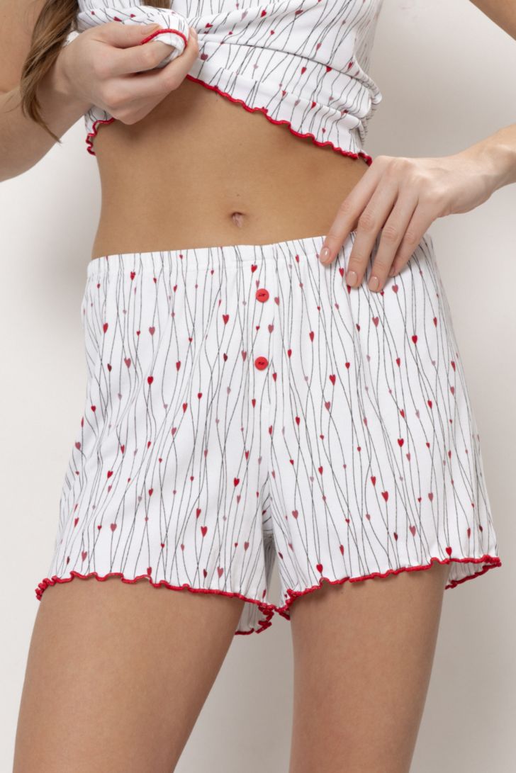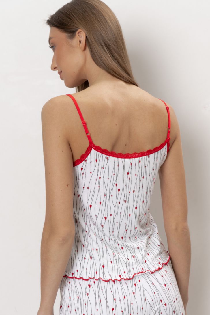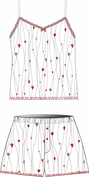 Легкая, романтичная и игривая пижама состоит из топа на тонких регулируемых бретелях и шорт на мягком поясе. Вырез топа V образный, декорирован контрастным кружевом. Низ топа обработан декоративной строцкой. Шорты свободного прилегания. Декорированы имитированным гульфиком с пуговицами и контрастным швом по низу.