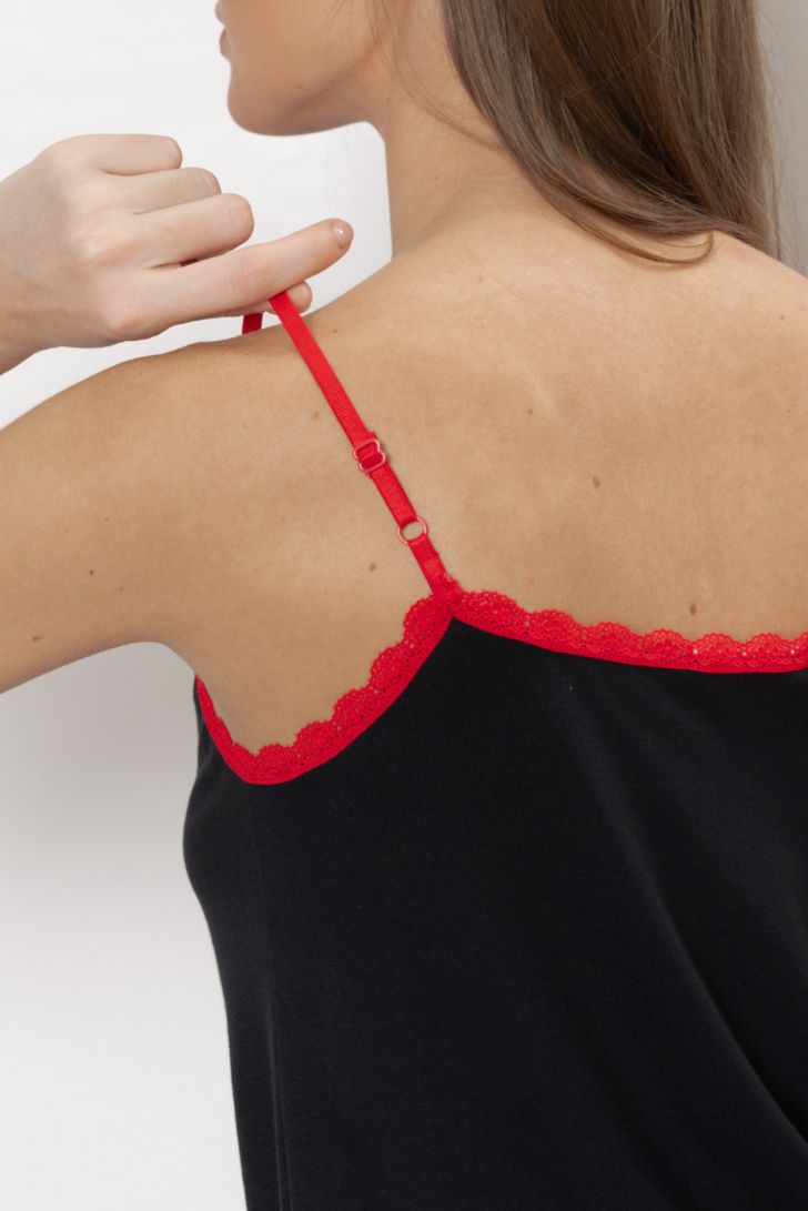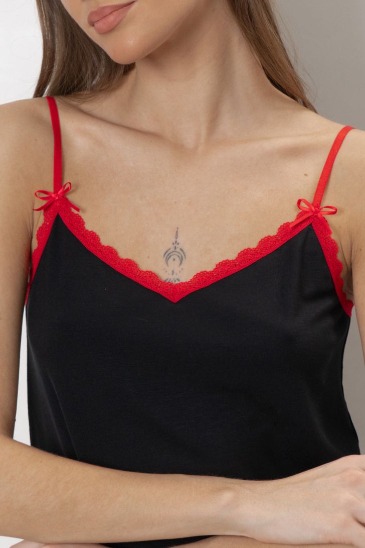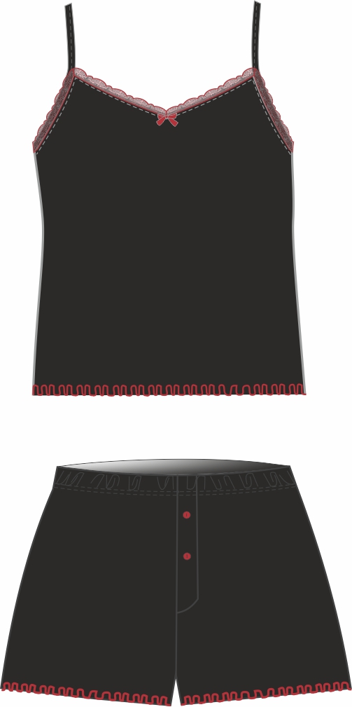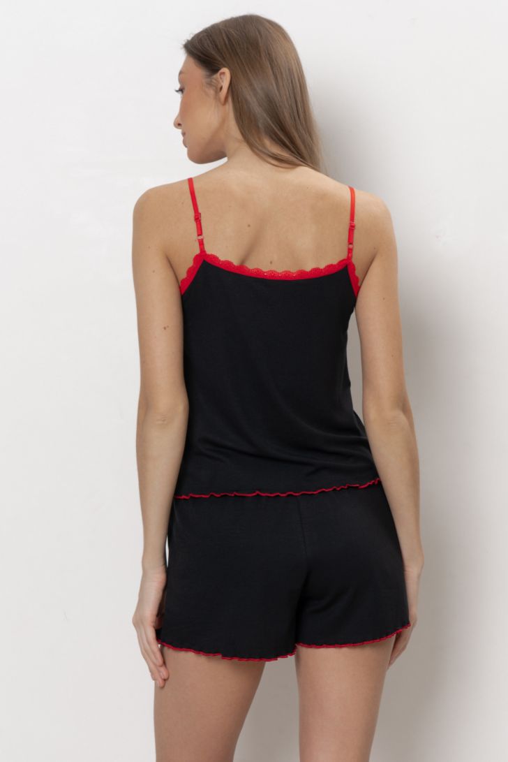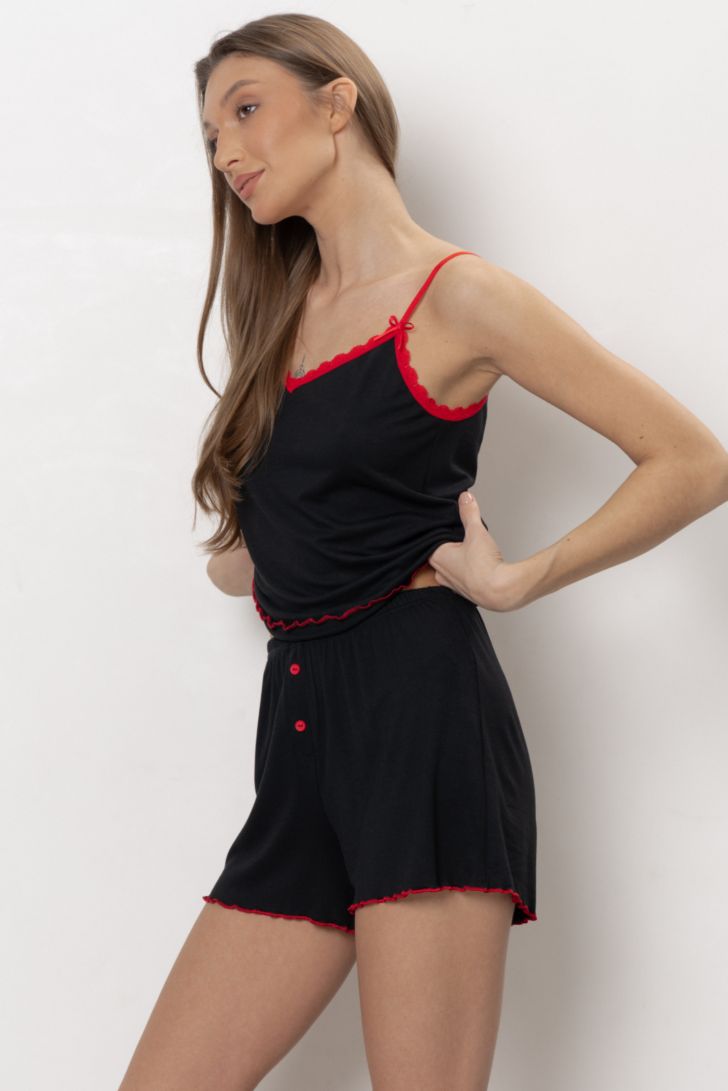 Легкая, романтицная и игривая пижама состоит из топа на тонких регулируемых бретелях и шорт на мягком поясе. Вырез топа V образный, декорирован контрастным кружевом. Низ топа обработан декоративной строцкой. Шорты свободного прилегания. Декорированы имитированным гульфиком с пуговичами и контрастным швом по низу.