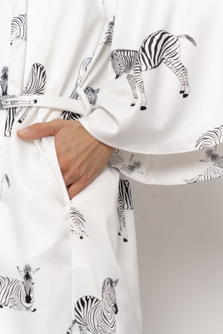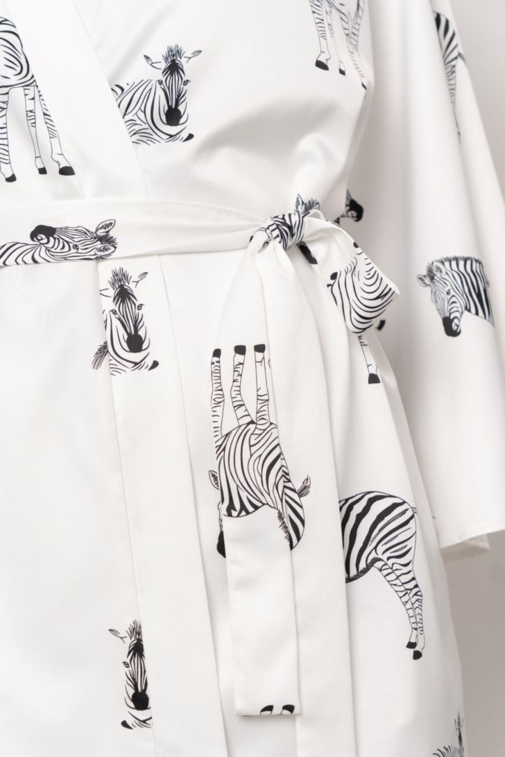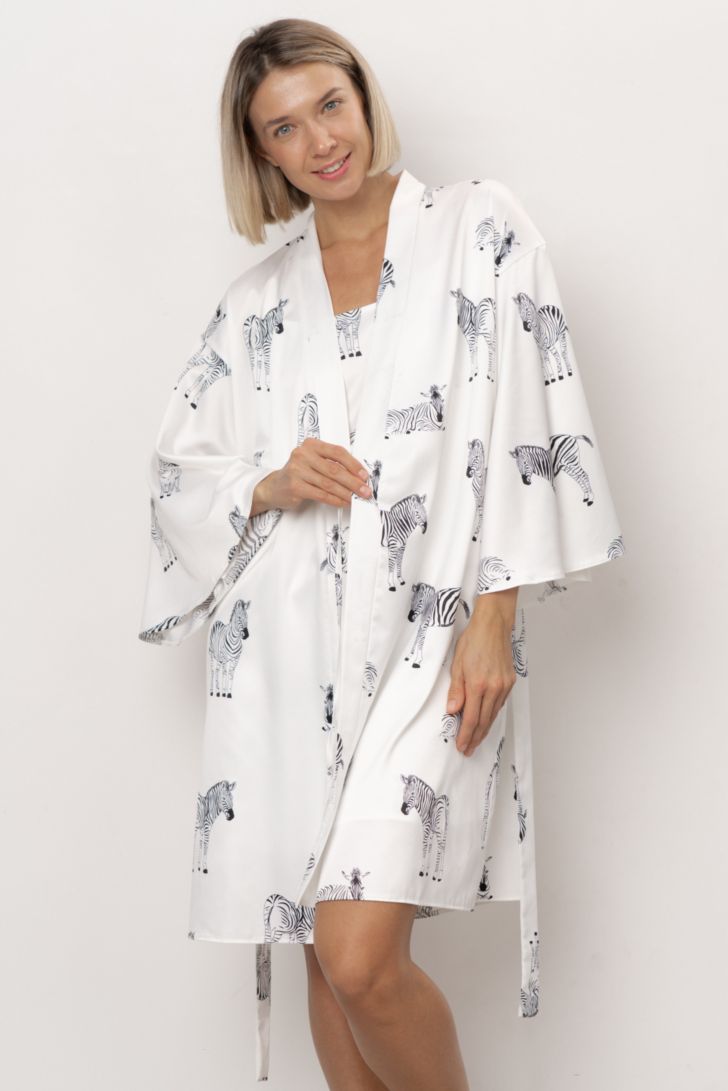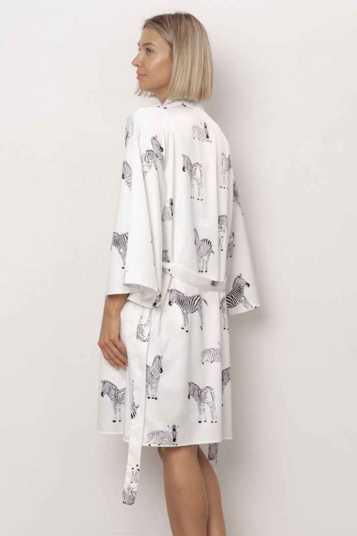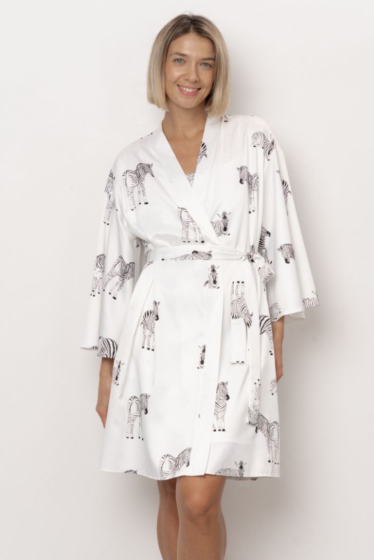 Пеньюар укороченный на запахе с рукавом 3/4 широкого кроя. Приспущенная линия плеча формирует расслабленный силуэт, а длинный пояс фиксирует модель и мягко подчёркивает линию талии.