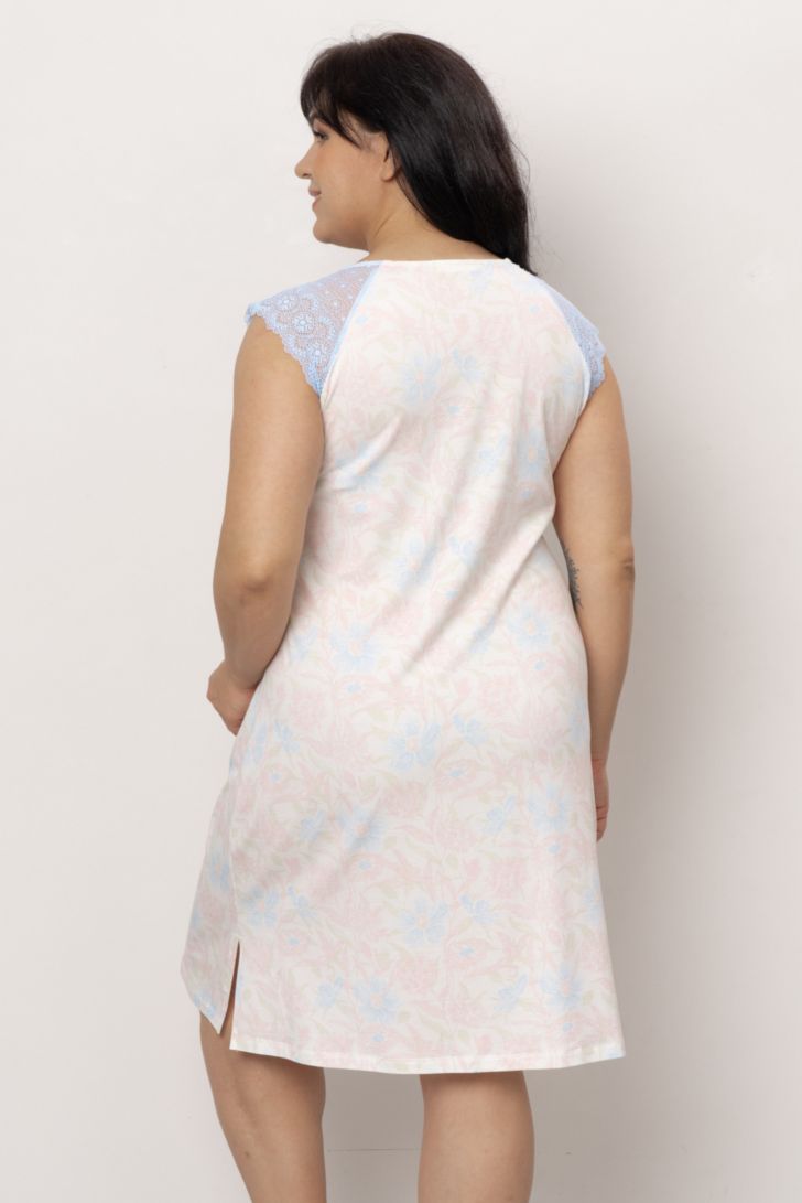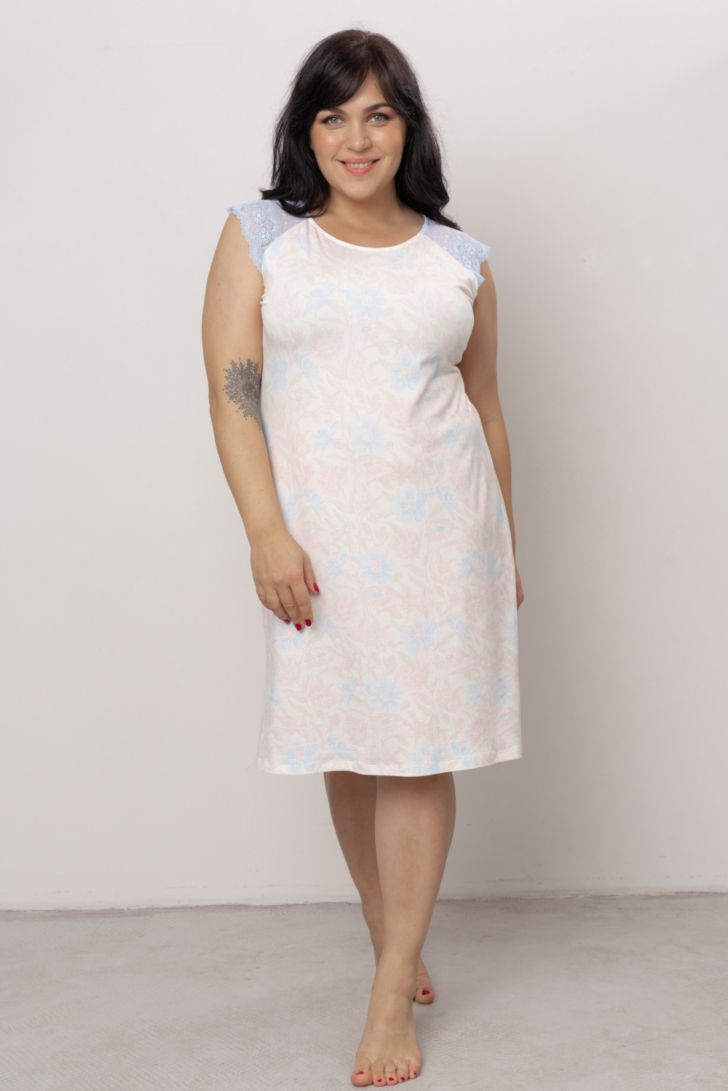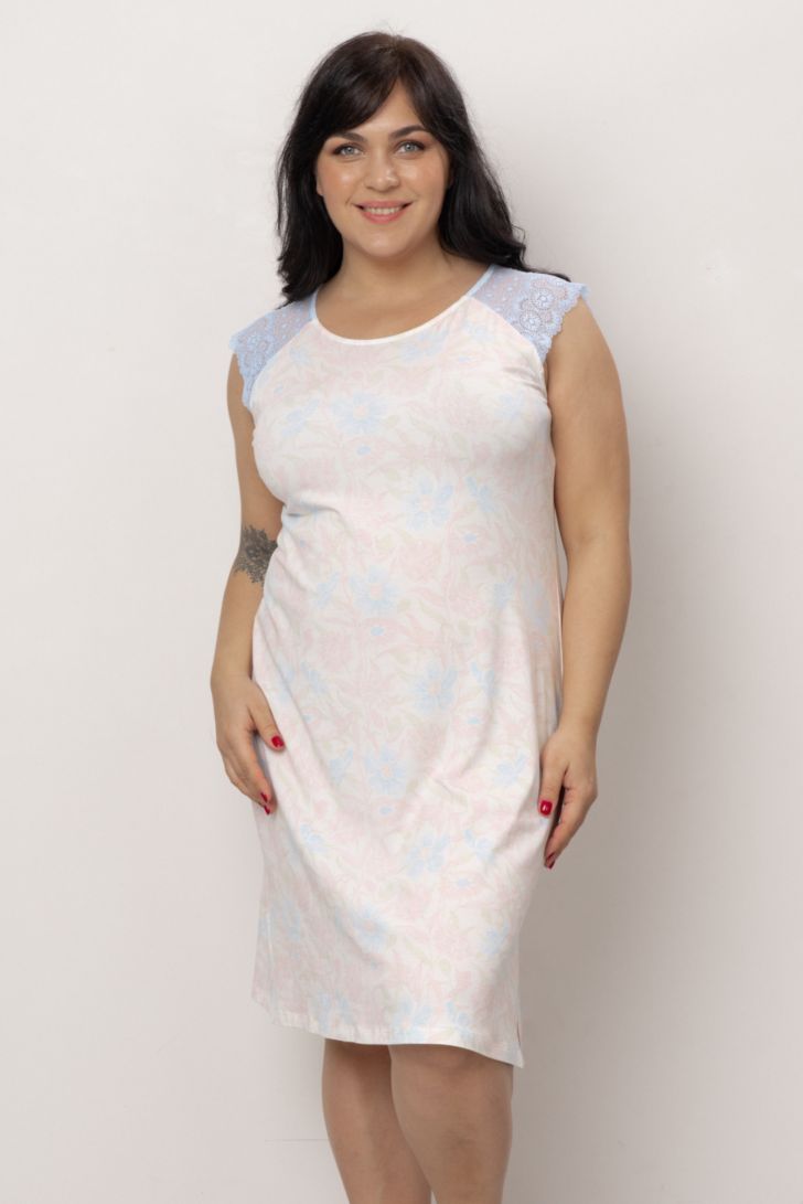 Сорочка женская свободного прилегания с круглым вырезом горловины. Декорирована широким кружевом по линии плеча.