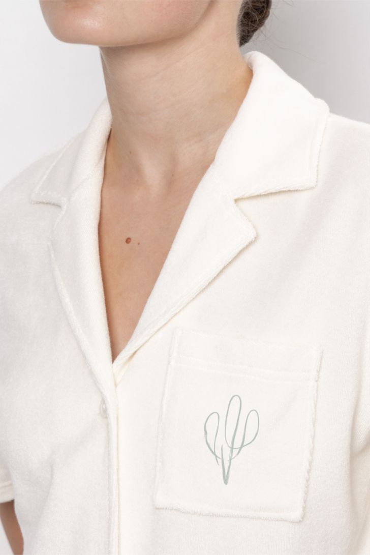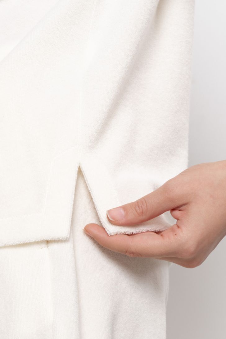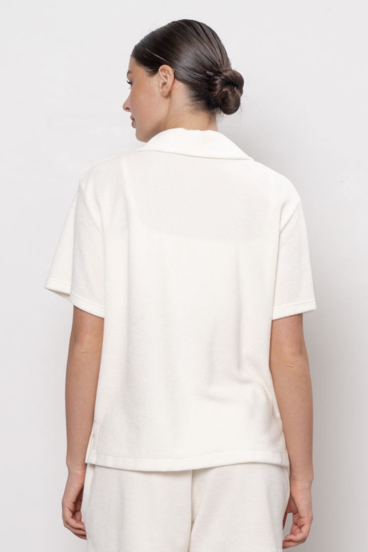 Эта блуза из нежного махрового полотна – как тёплое объятие после долгого дня. Воздушная, но плотная ткань приятна к телу, дарит ощущение комфорта и заботы. Крой – свободный и продуманный до мелочей: не сковывает движений, но и не болтается бесформенно. Аккуратный воротник, короткий рукав делают её идеальной для домашних посиделок, утреннего кофе или отдыха под пледом.