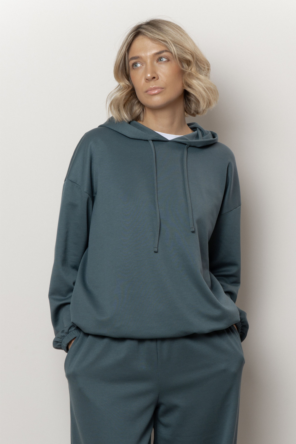 Худи свободного прилегания с капюшоном и спущенной линией плеча. Капюшон и низ изделия на шнурке, который регулирует посадку изделия. Рукава на манжете. Худи из нового полотна cupro, это не про дизайн, а про тактильные ощущения и нейтральную