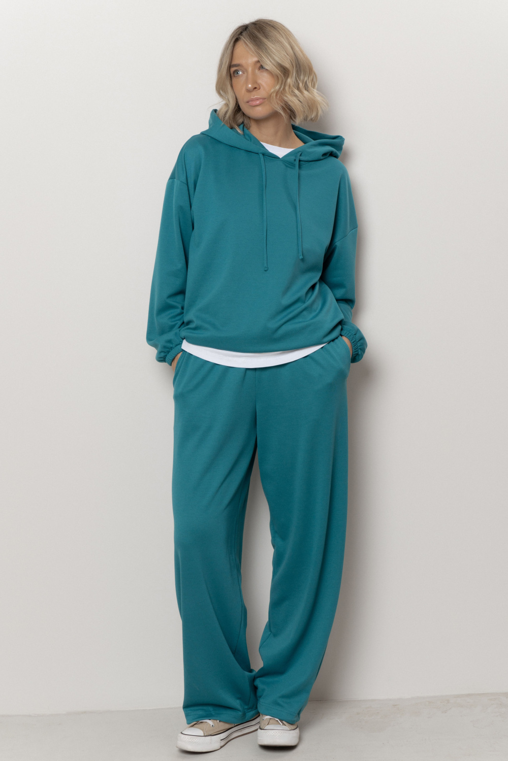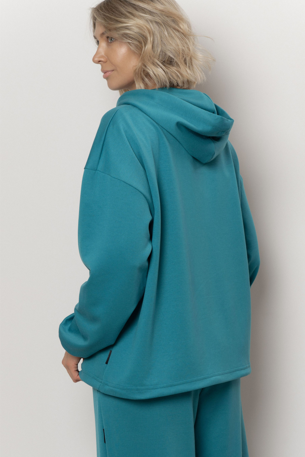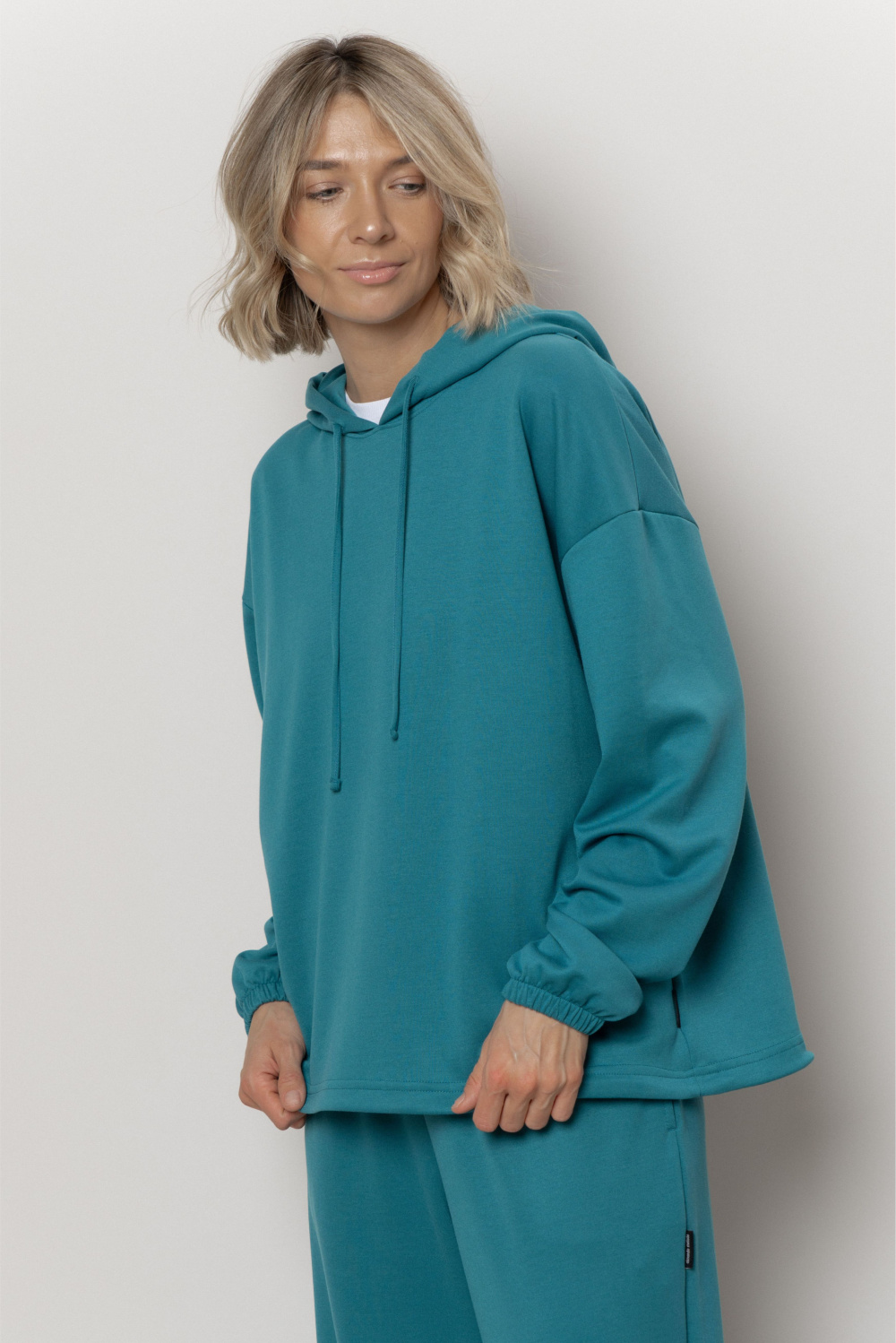 Худи свободного прилегания с капюшоном и спущенной линией плеча. Капюшон и низ изделия на шнурке, который регулирует посадку изделия. Рукава на манжете. Худи из нового полотна cupro, это не про дизайн, а про тактильные ощущения и нейтральную