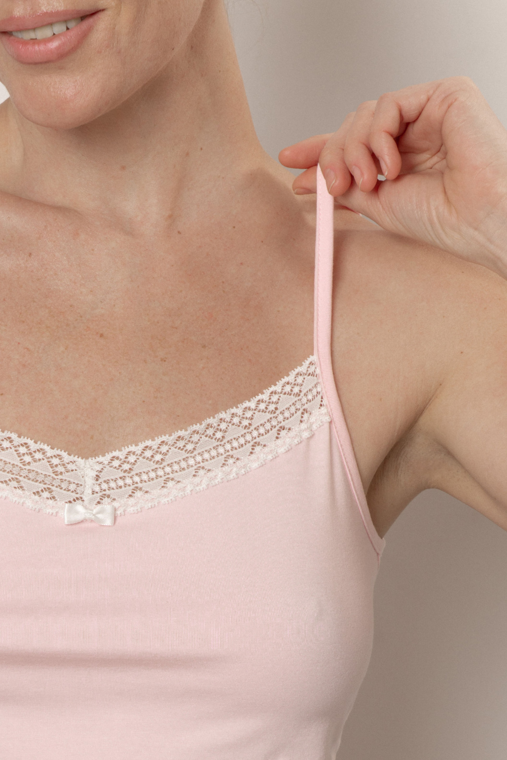 Майка на тонких регулируемых бретелях. V-образный вырез декорирован тонкой кружевной отделкой и атласным бантом