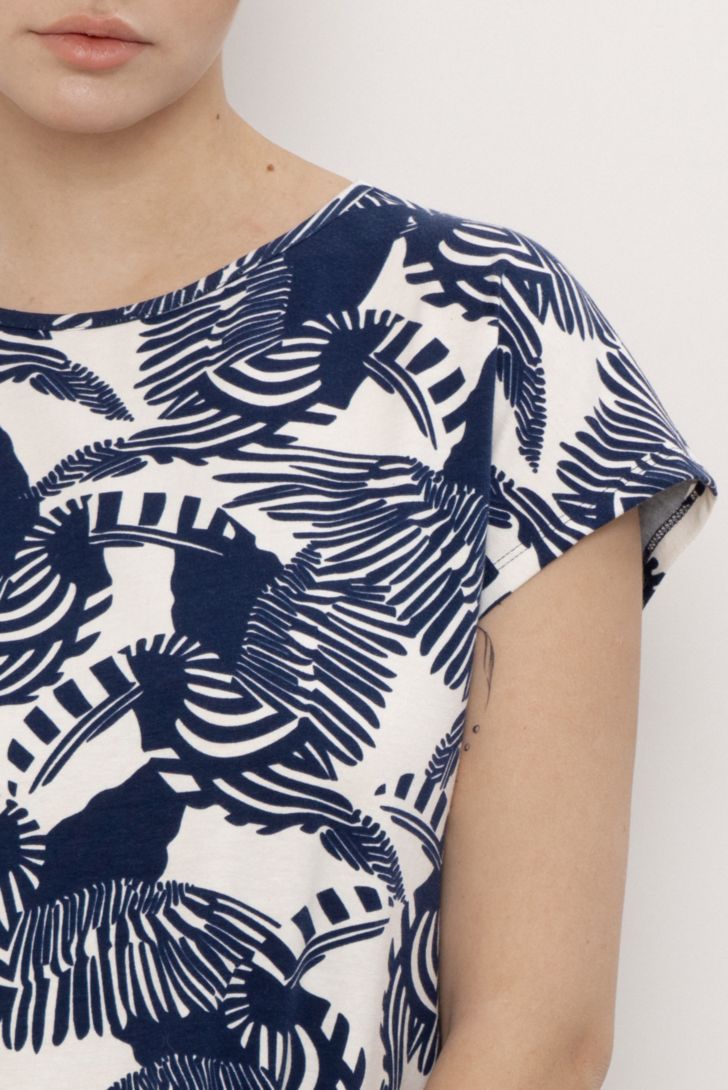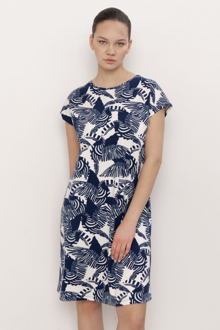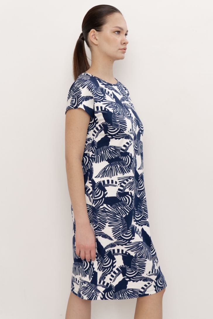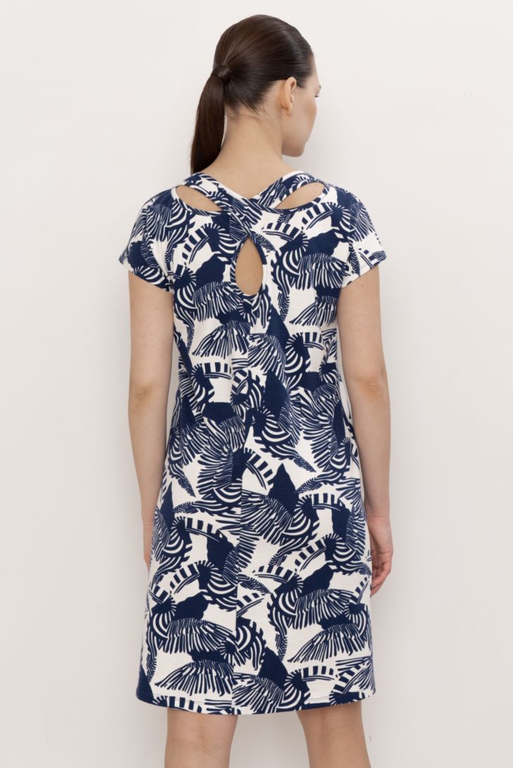 Платье прямого силуэта со спущенным коротким рукавом и круглой горловиной, с декоративным узлом на спине. В боковом шве брендовая нашивка.