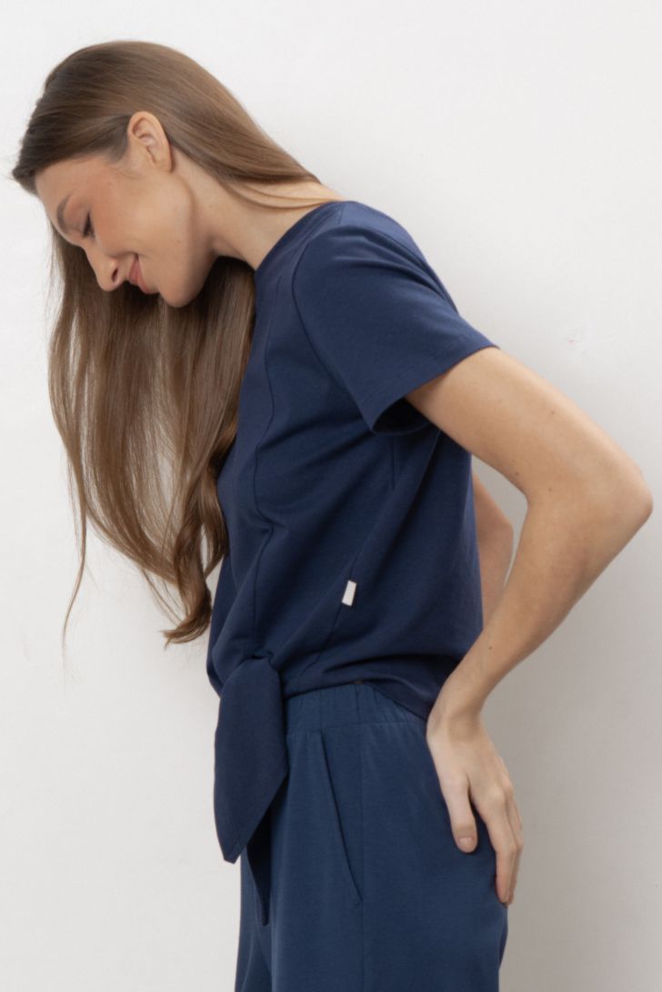 Футболка свободного силуэта с асимметричным низом. Особенность модели — удлинённый низ с разрезом наискосок. Рукава короткие, горловина — круглая. Дизайн лаконичный, без принтов. Такой фасон придаёт образу неформальность и лёгкую динамику, отлично подойдёт для повседневного стиля.