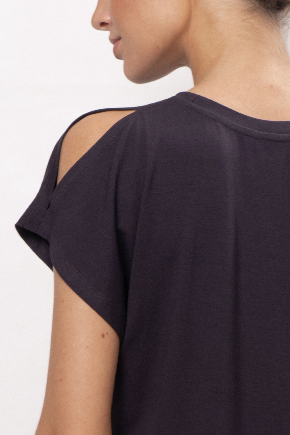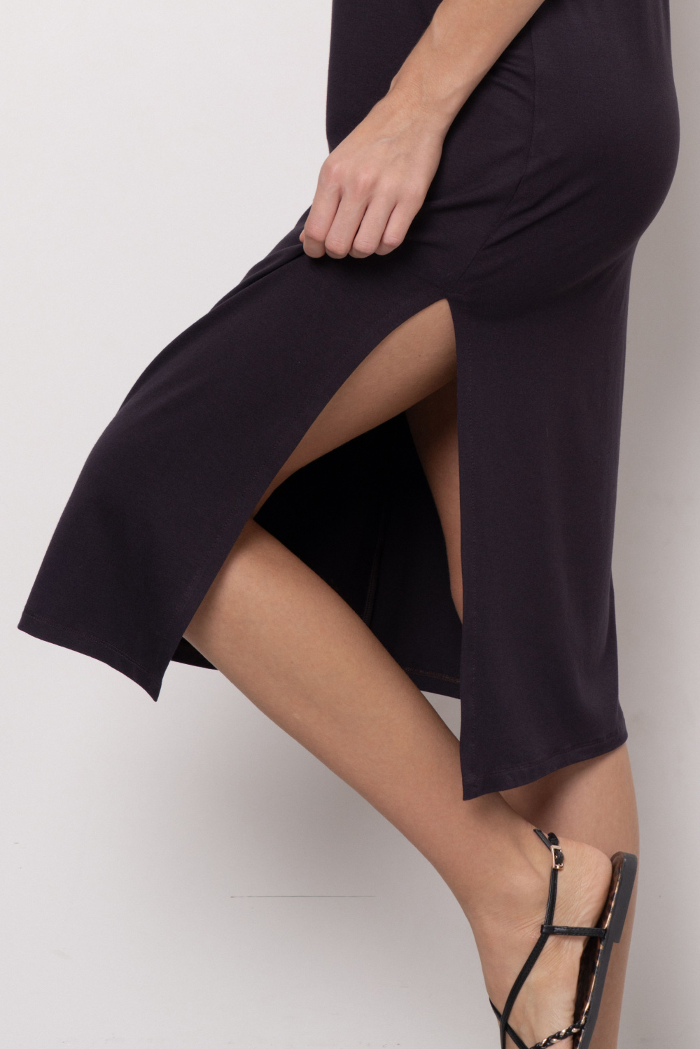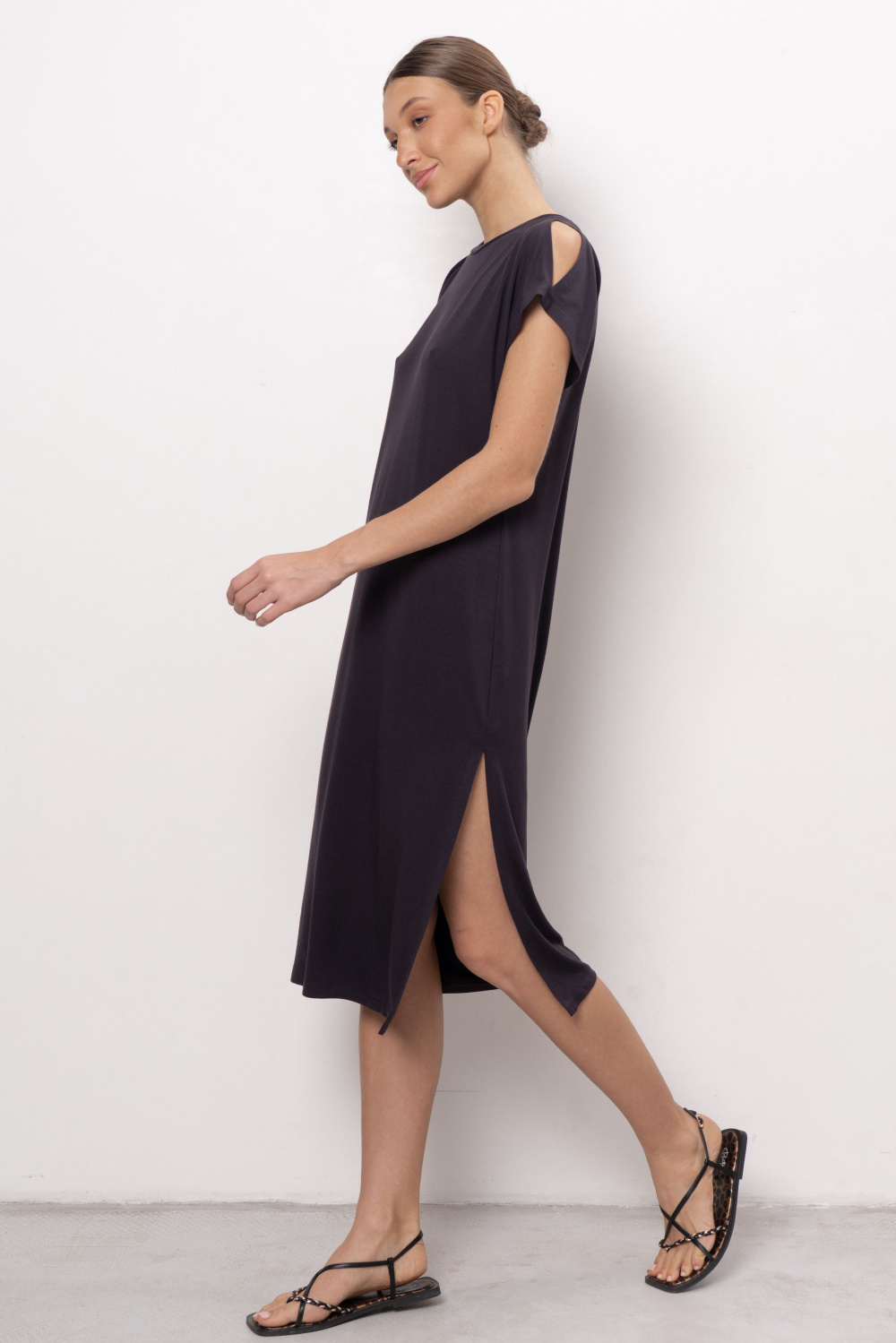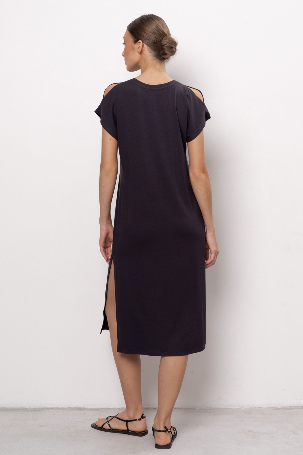 Свободное платье в длине миди с мягкой линией плеча с разрезами. Оно идеально подойдет для создания расслабленного, но при этом очень стильного образа. Вырез горловины круглый. В боковом шве изящный разрез.
