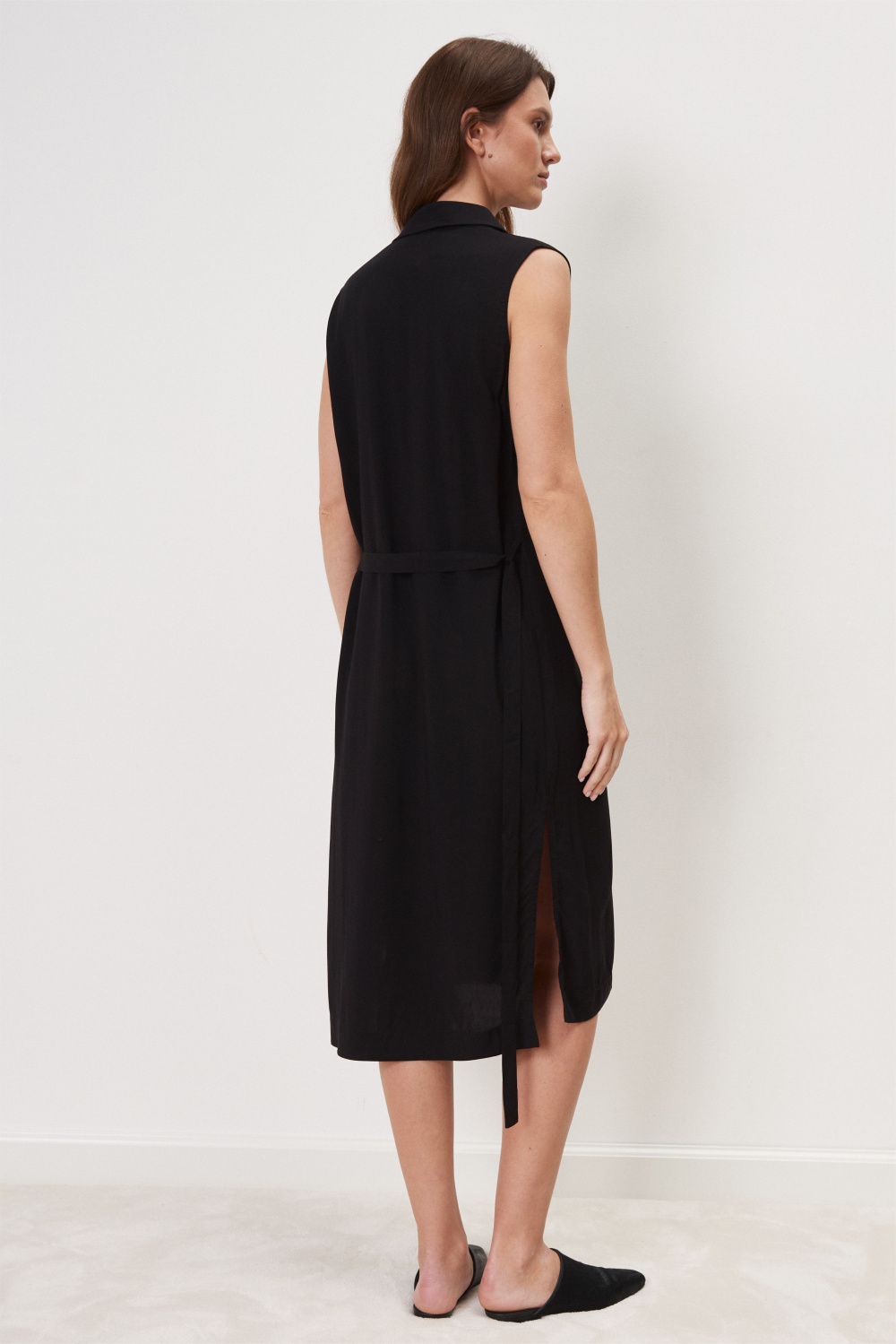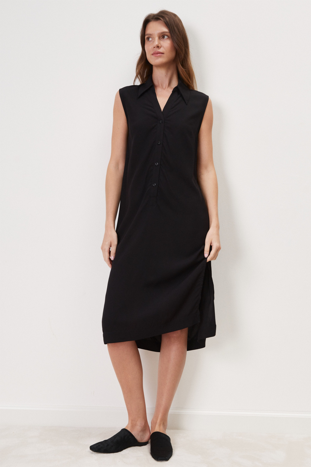 Платье декорировано функциональной планкой на пуговицах и отложным воротником. Пришивной пояс подчеркивает линию талии. По бокам платья разрезы.