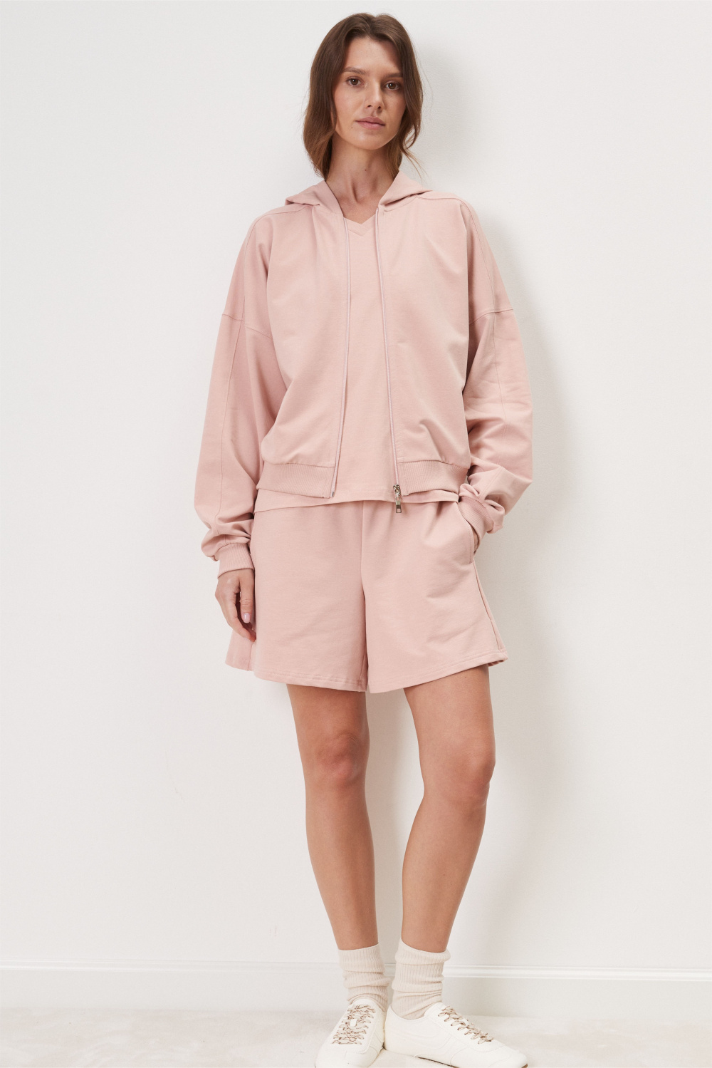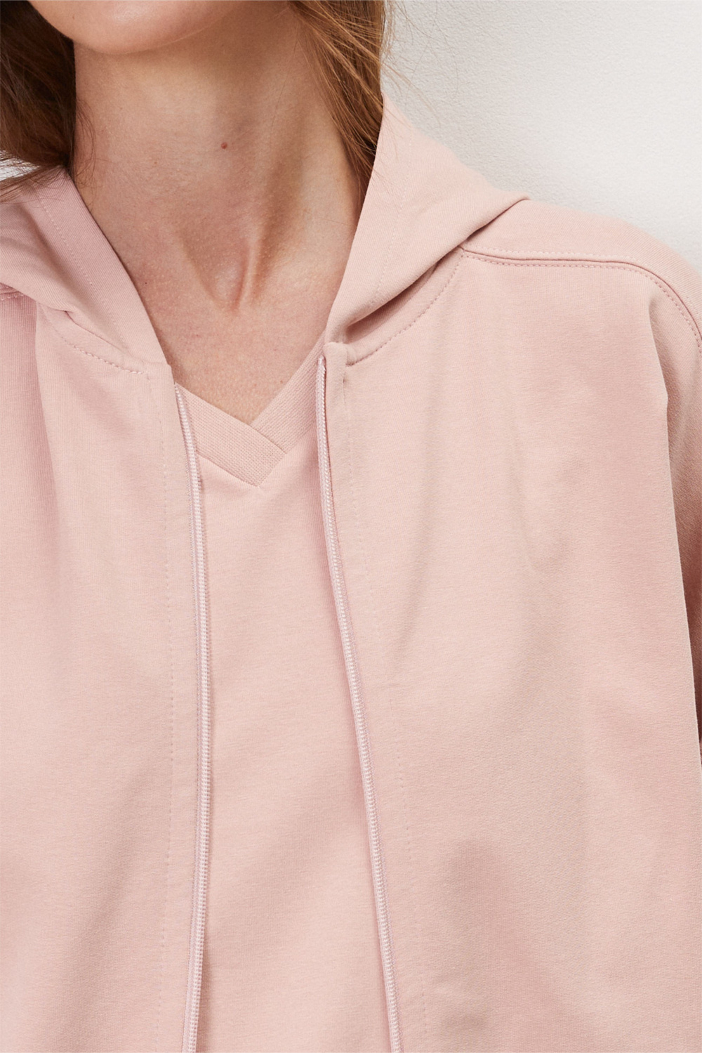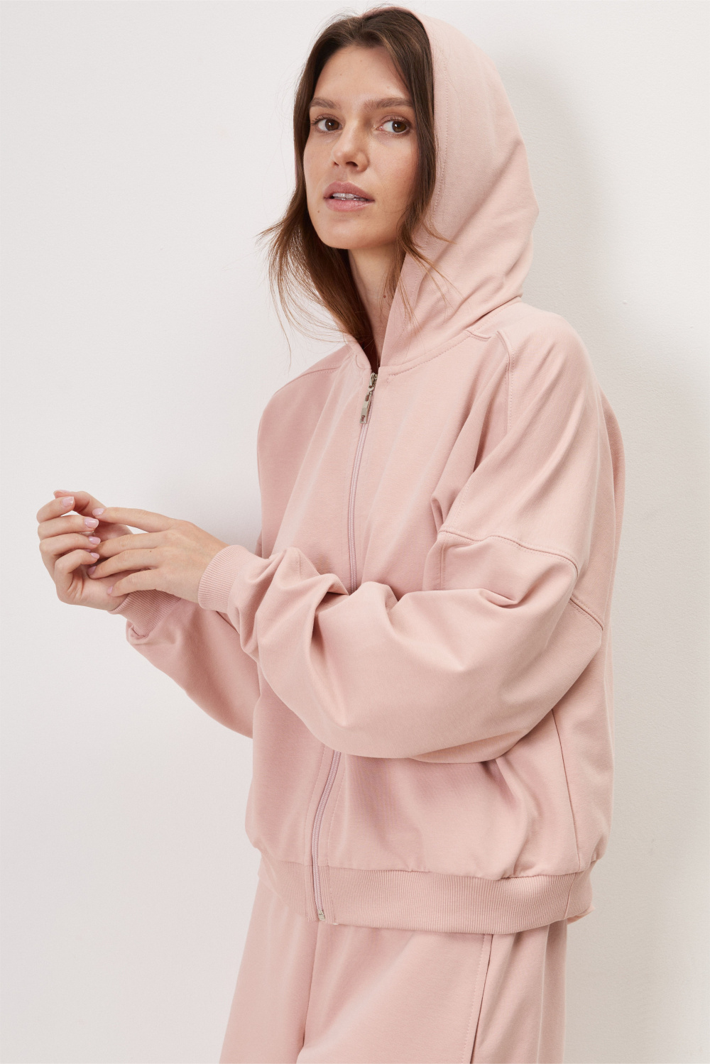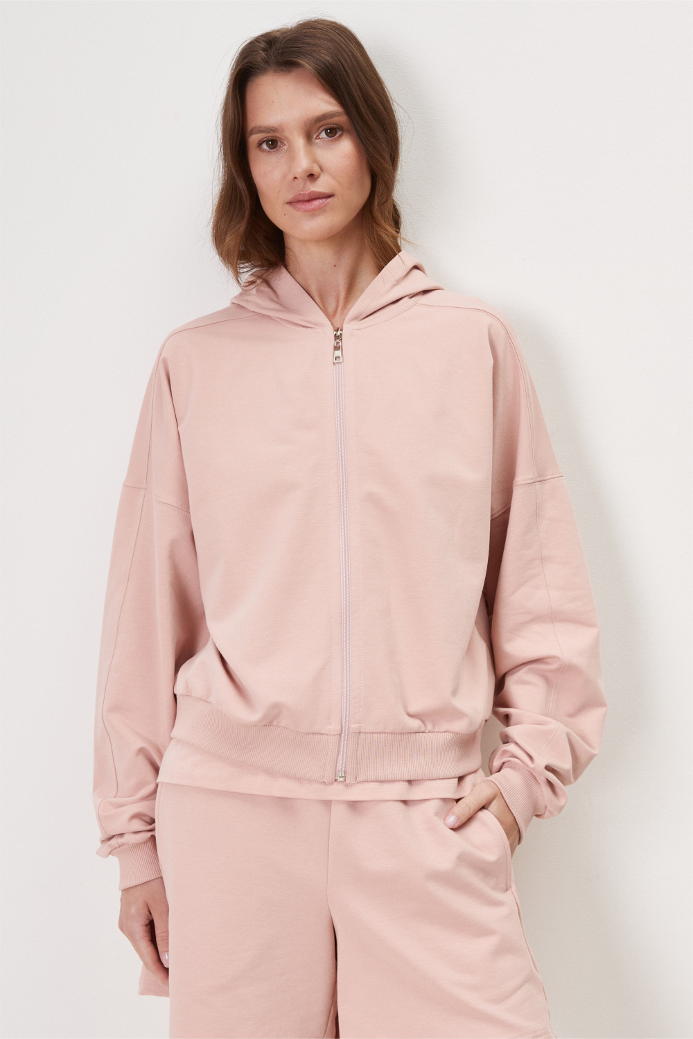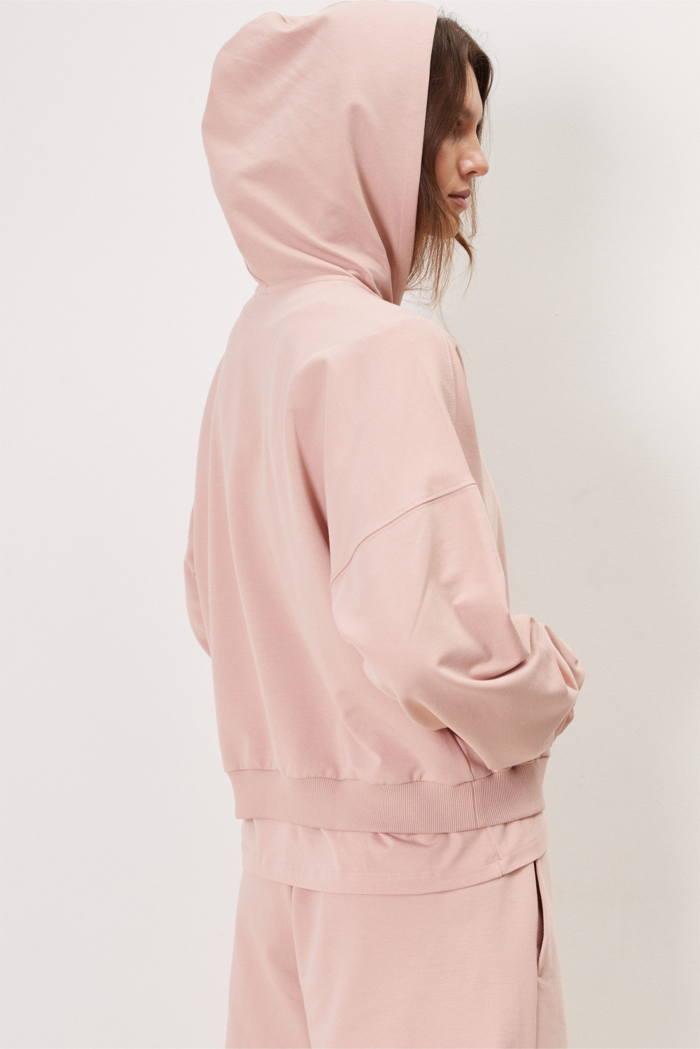 Укороченная куртка из футера с застежкой на молнию с капюшоном и спущенной линией плеча.
