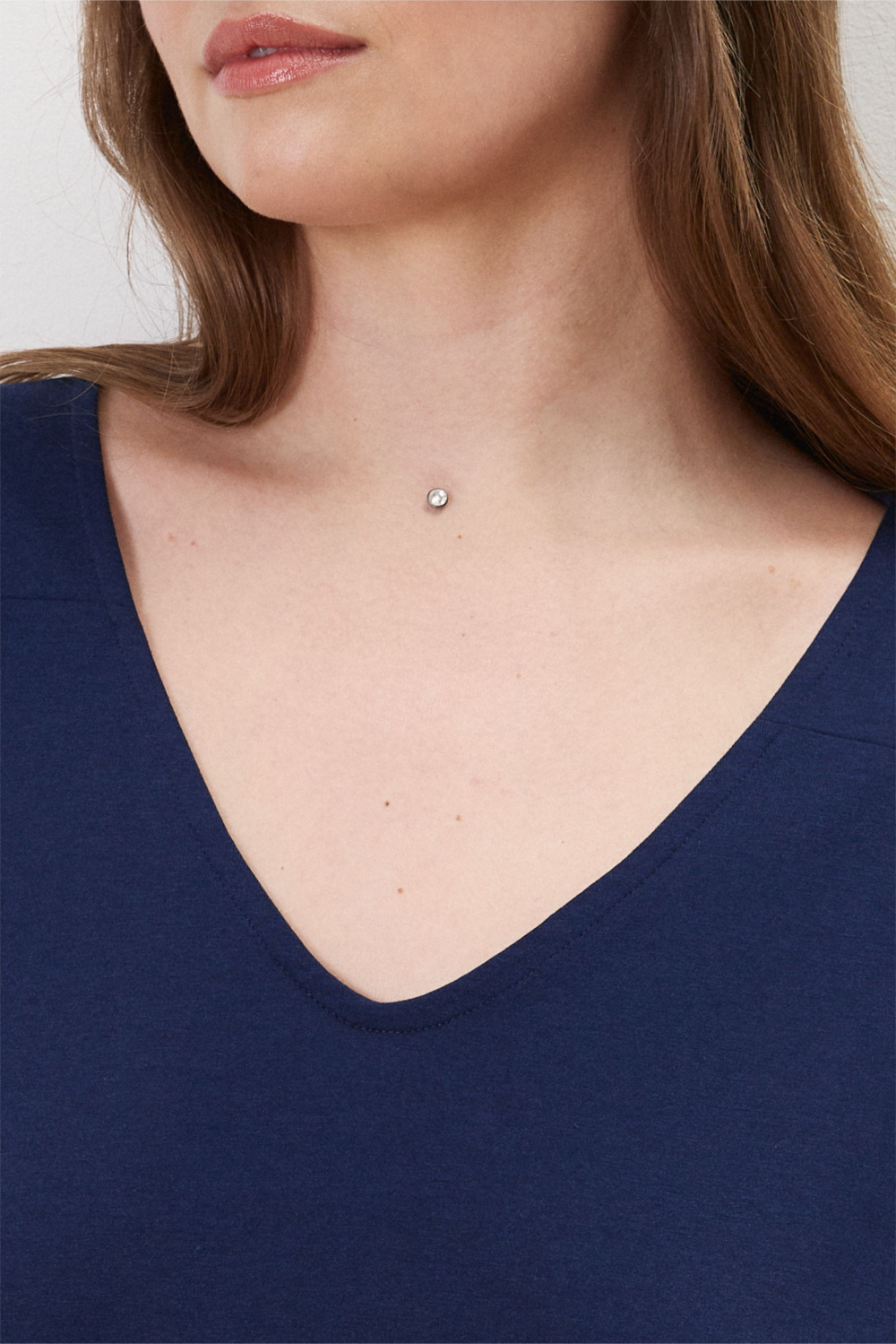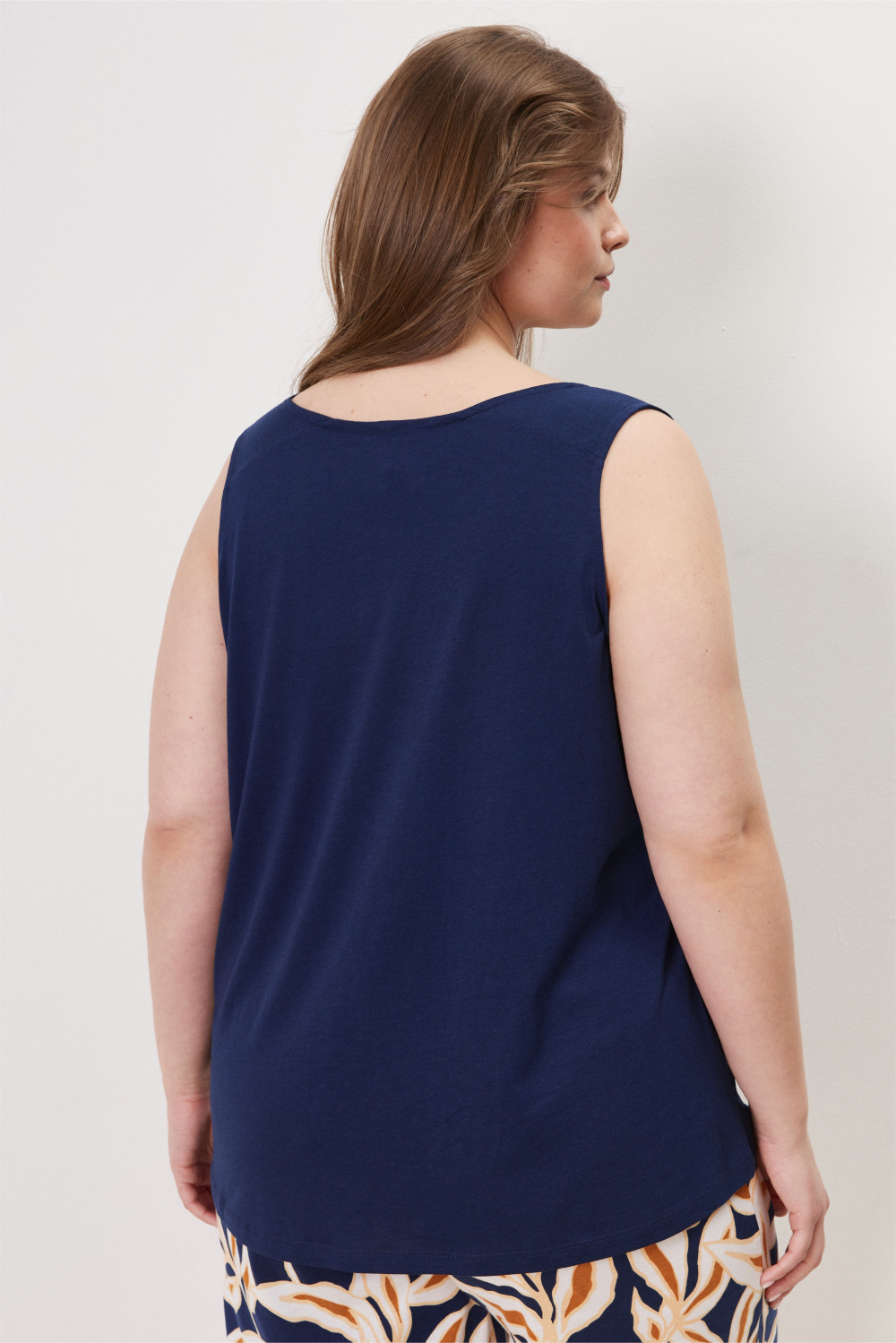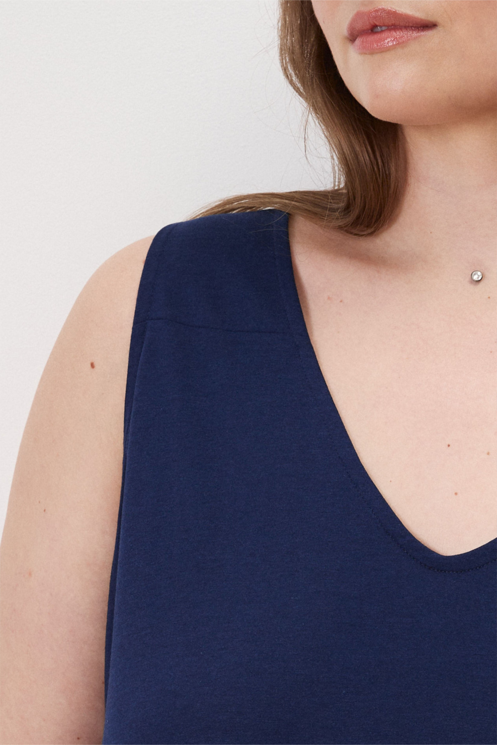 Топ свободного прилегания на широких бретелях. V-образный вырез горловины элегантно подчеркивает линию шеи, визуально её удлиняя.