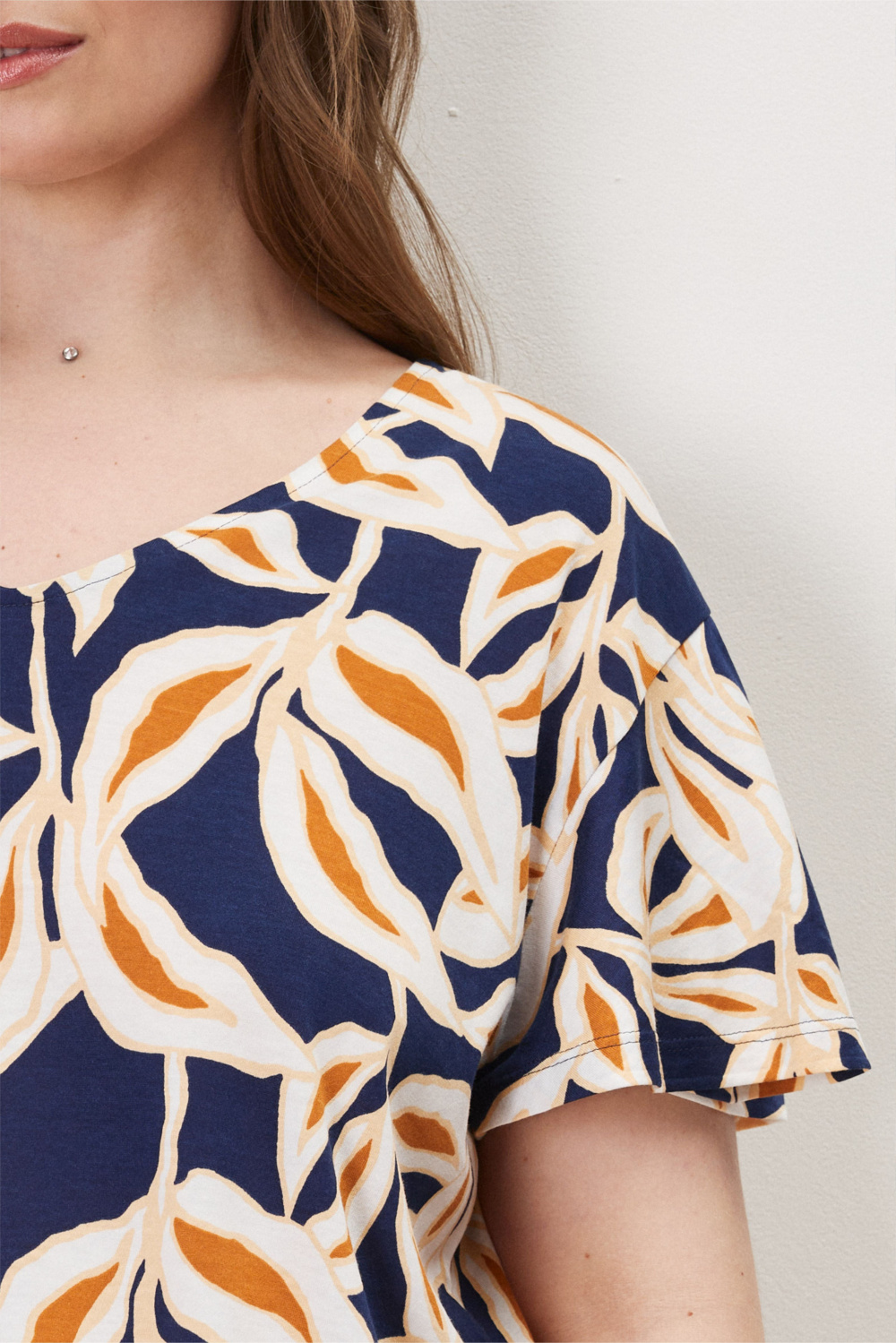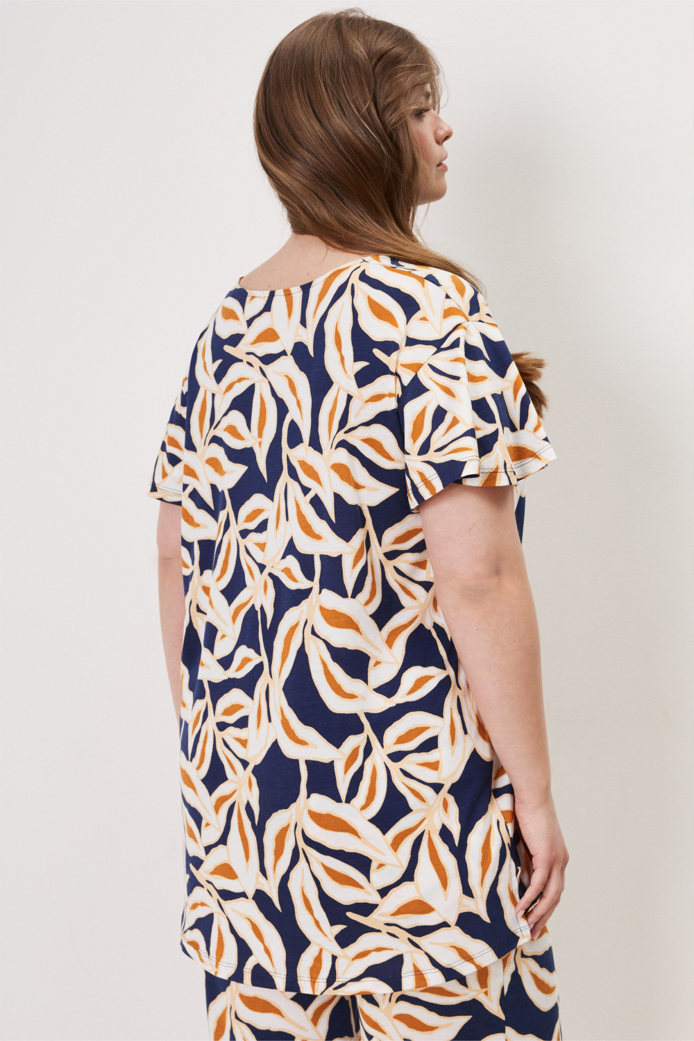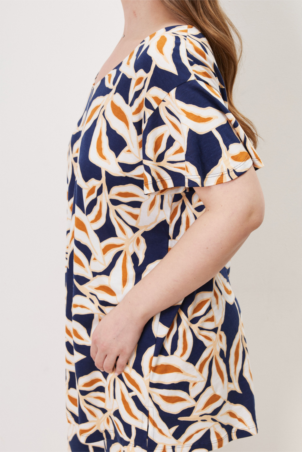 Свободная туника с V-образным вырезом горловины. Рукава-«крылышки» придают тунике игривый, романтичный образ.