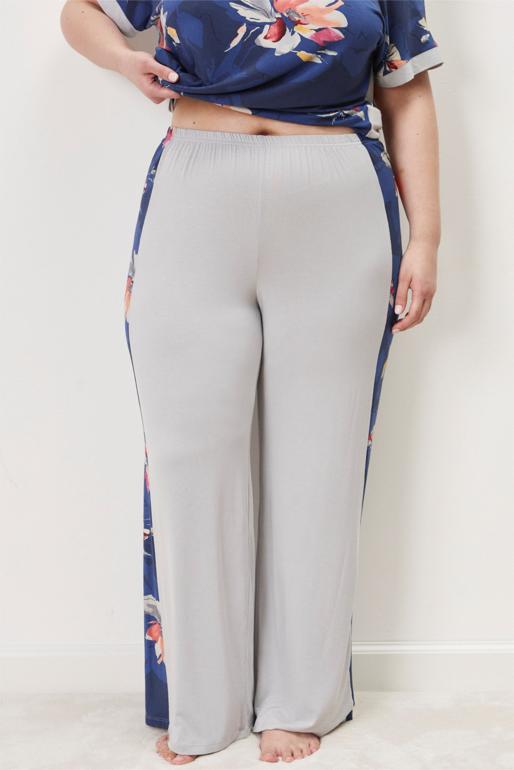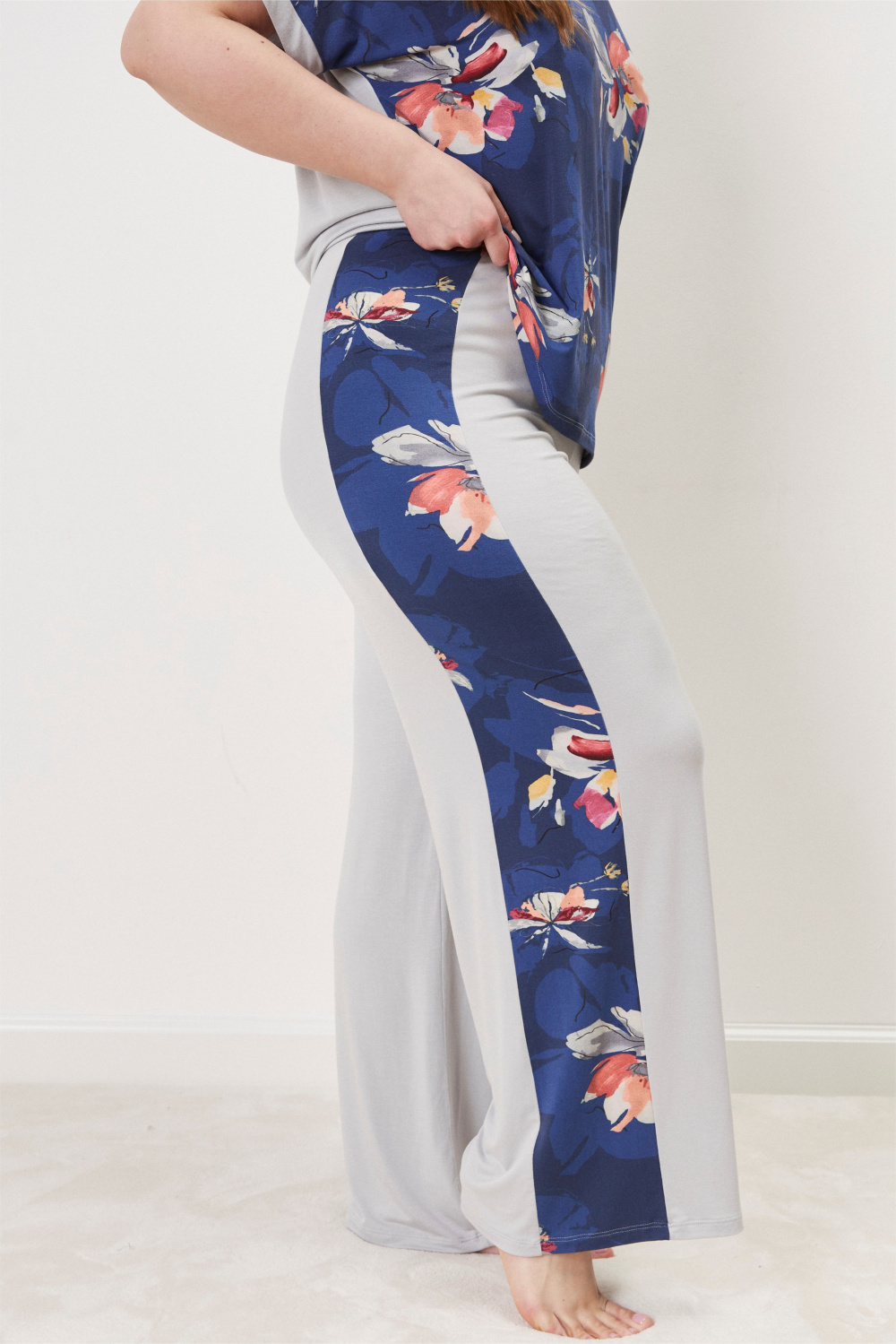 Пижама состоит из футболки и свободных брюк-палаццо.