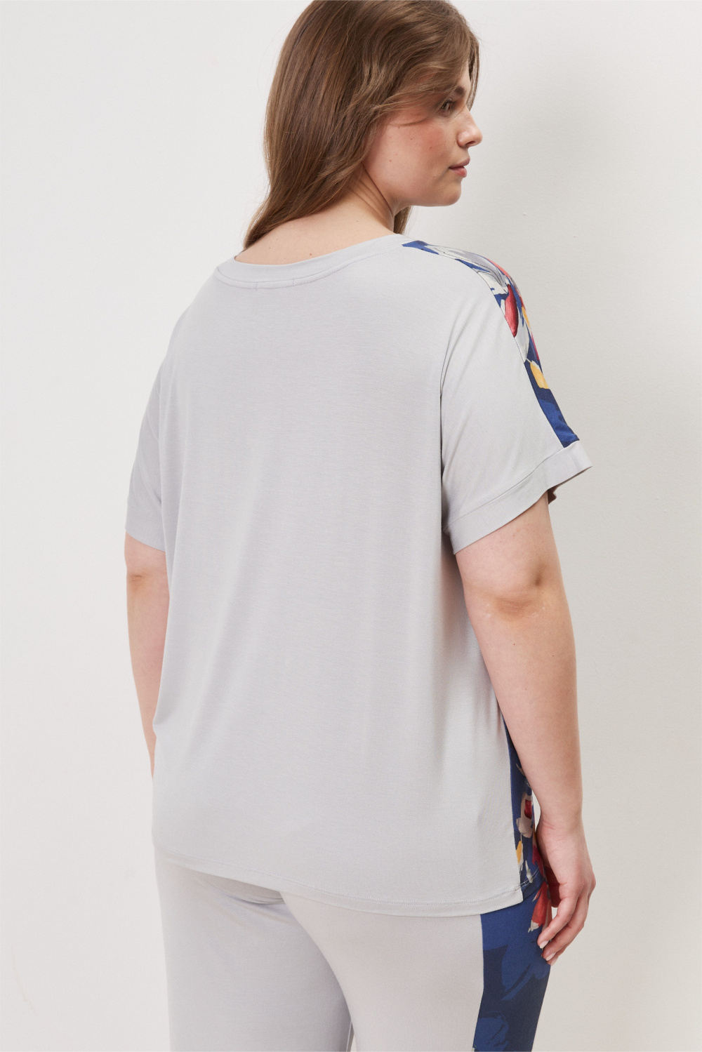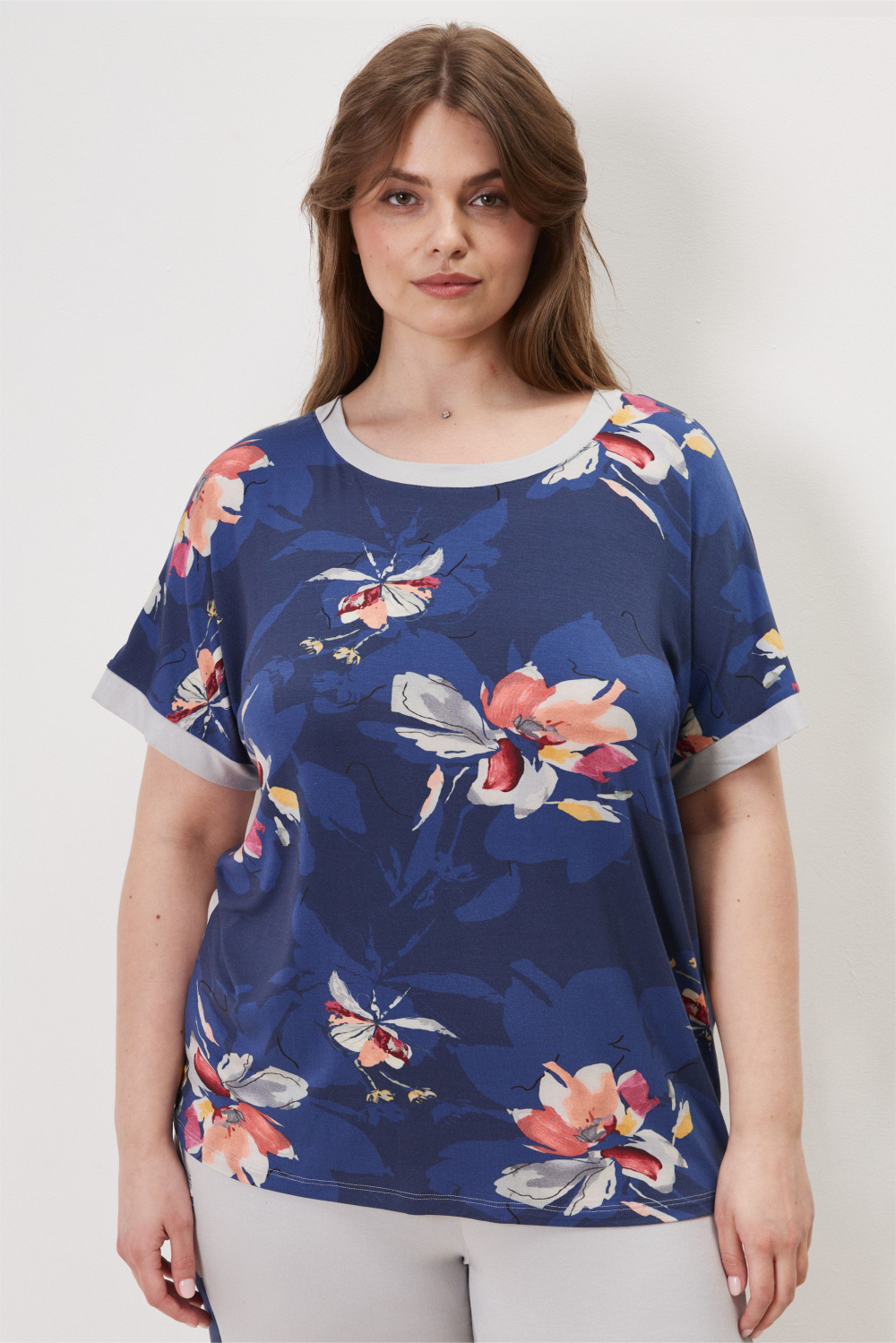 Круглая горловина футболки и края цельнокроеных рукавов подчеркнуты контрастной отделкой, а брюки комфортной высокой посадки декорированы широкими лампасами с авторским цветочным принтом.