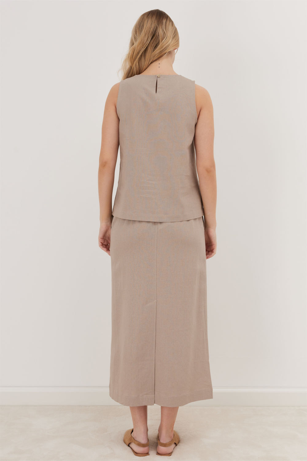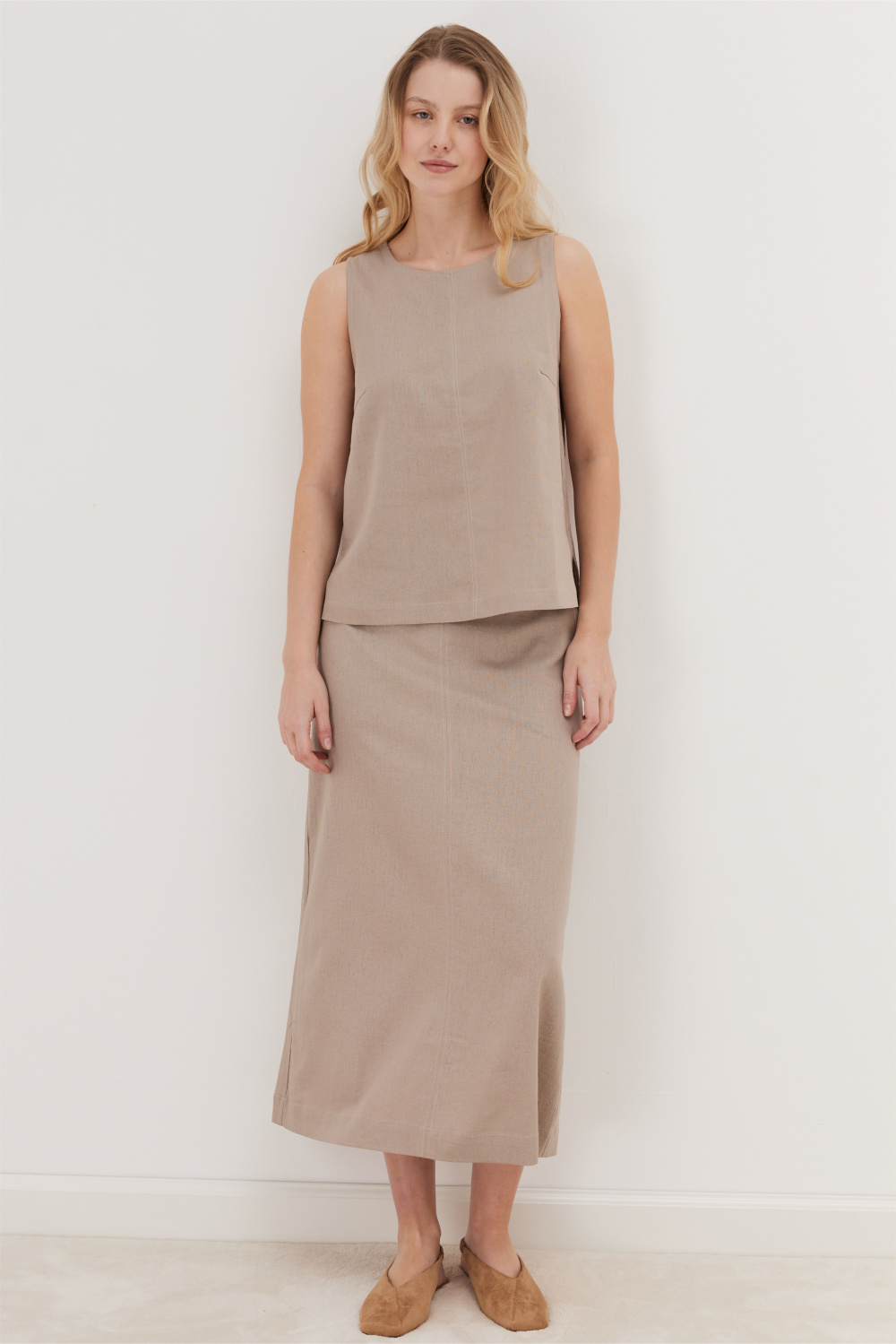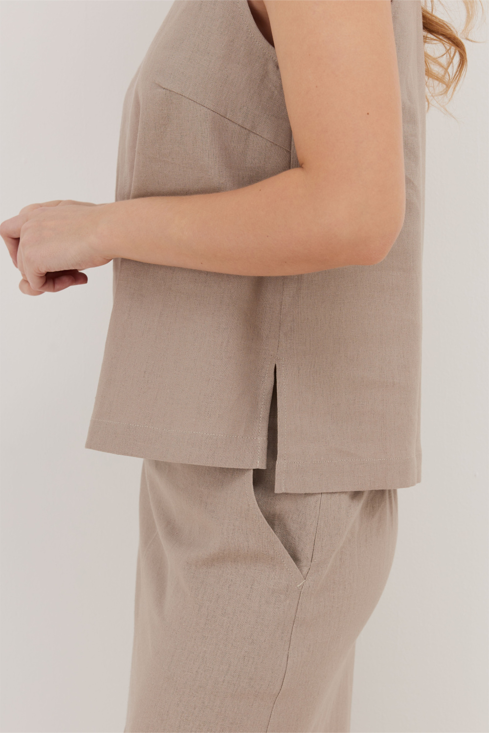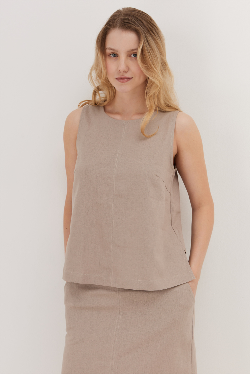 Минималистичный классический топ прямого кроя без рукавов с круглой горловиной и застежкой на пуговицу на спинке. Вертикальный шов по центру полочки визуально вытягивает силуэт.