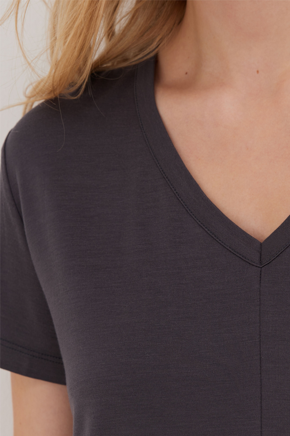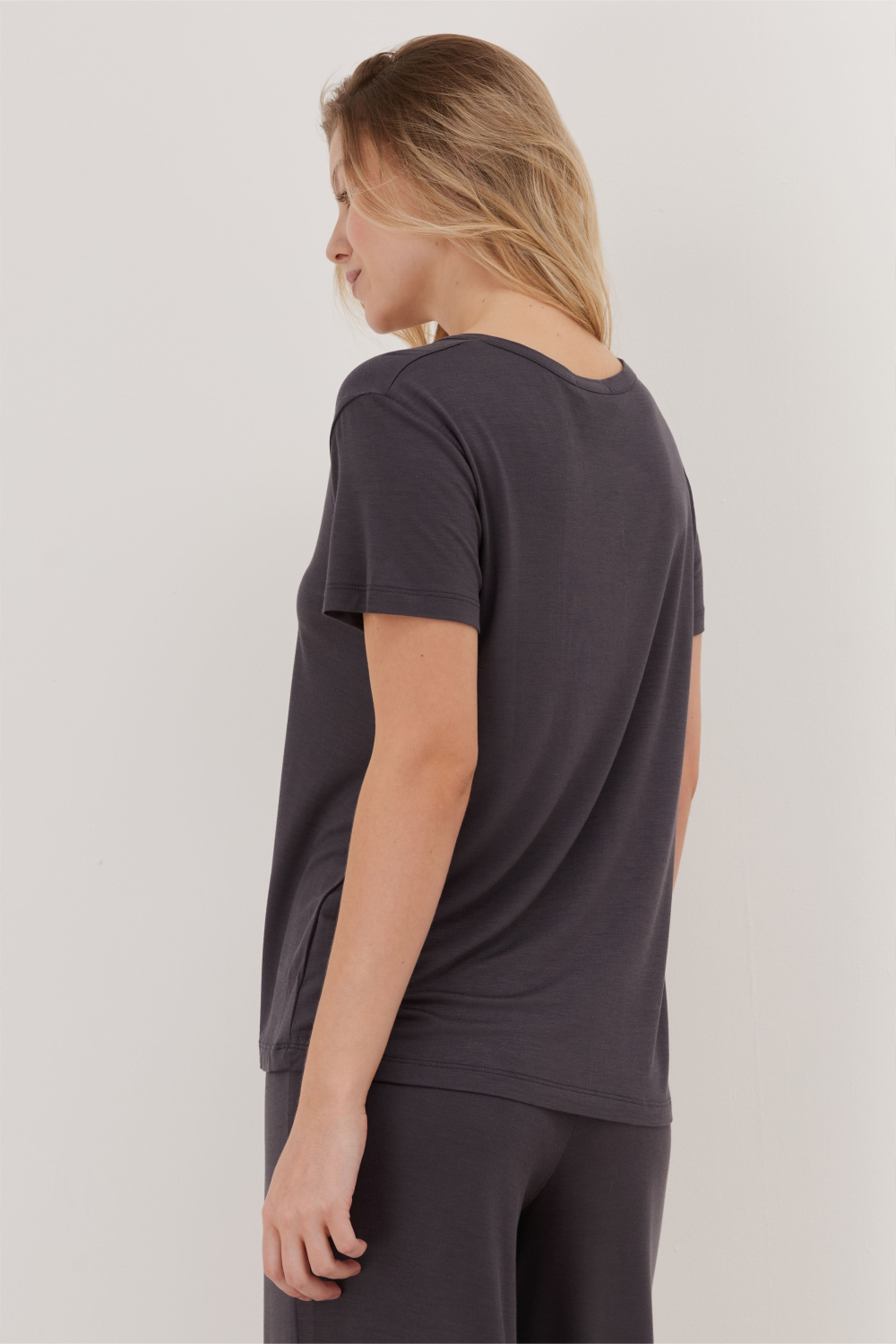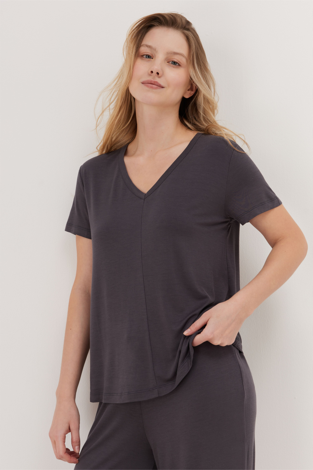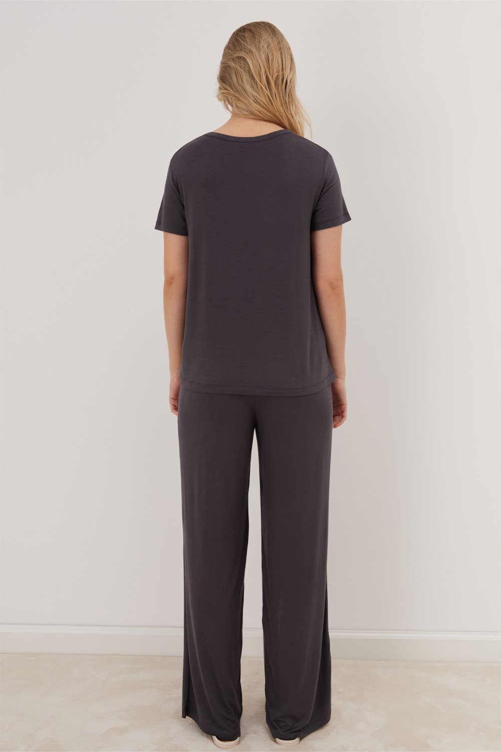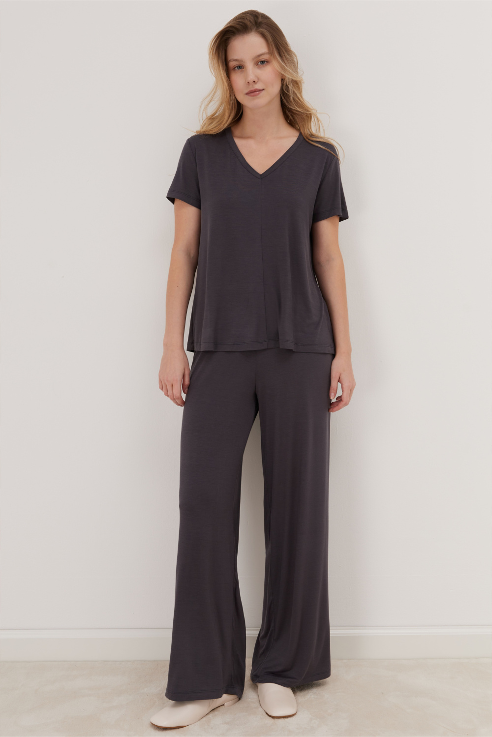 Домашний костюм из мягкого бамбукового трикотажа, состоящий из футболки свободного кроя и прямых брюк. Футболка с V-образным вырезом и короткими рукавами дополнена центральным вертикальным швом, создающим строгий и современный силуэт.