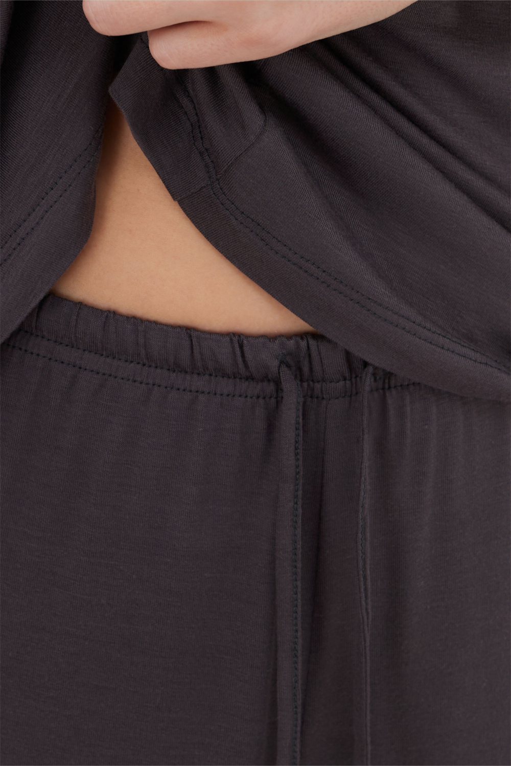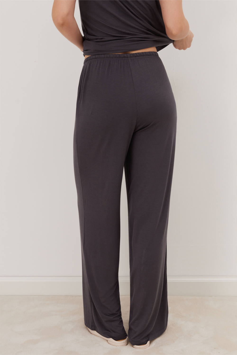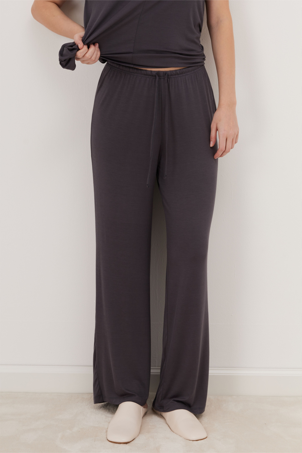 Брюки на эластичном поясе с регулируемым шнурком обеспечивают комфортную посадку. Премиальный состав ткани (94% бамбук) дарит исключительную нежность при соприкосновении с кожей, обладает антистатическим и гипоаллергенным эффектом.