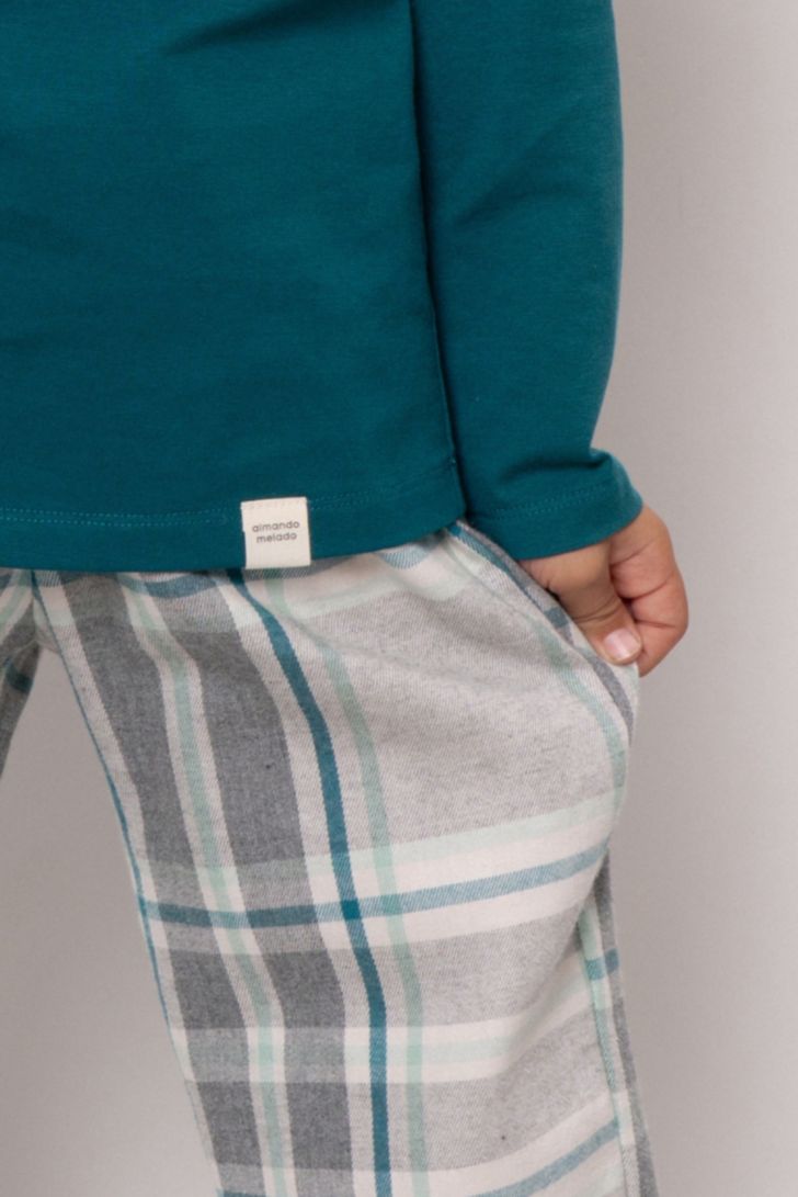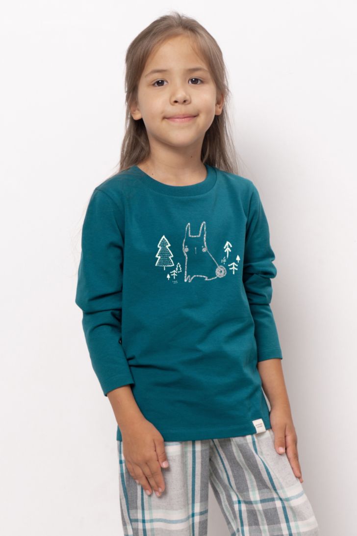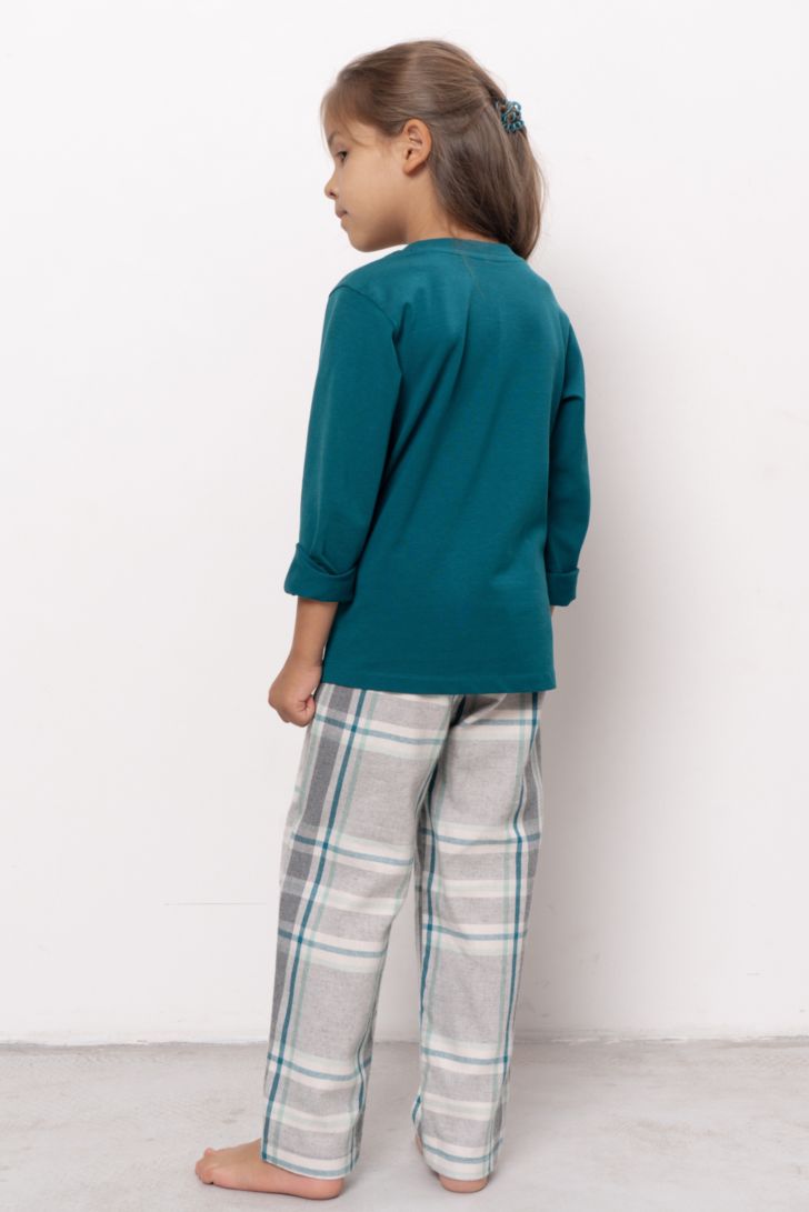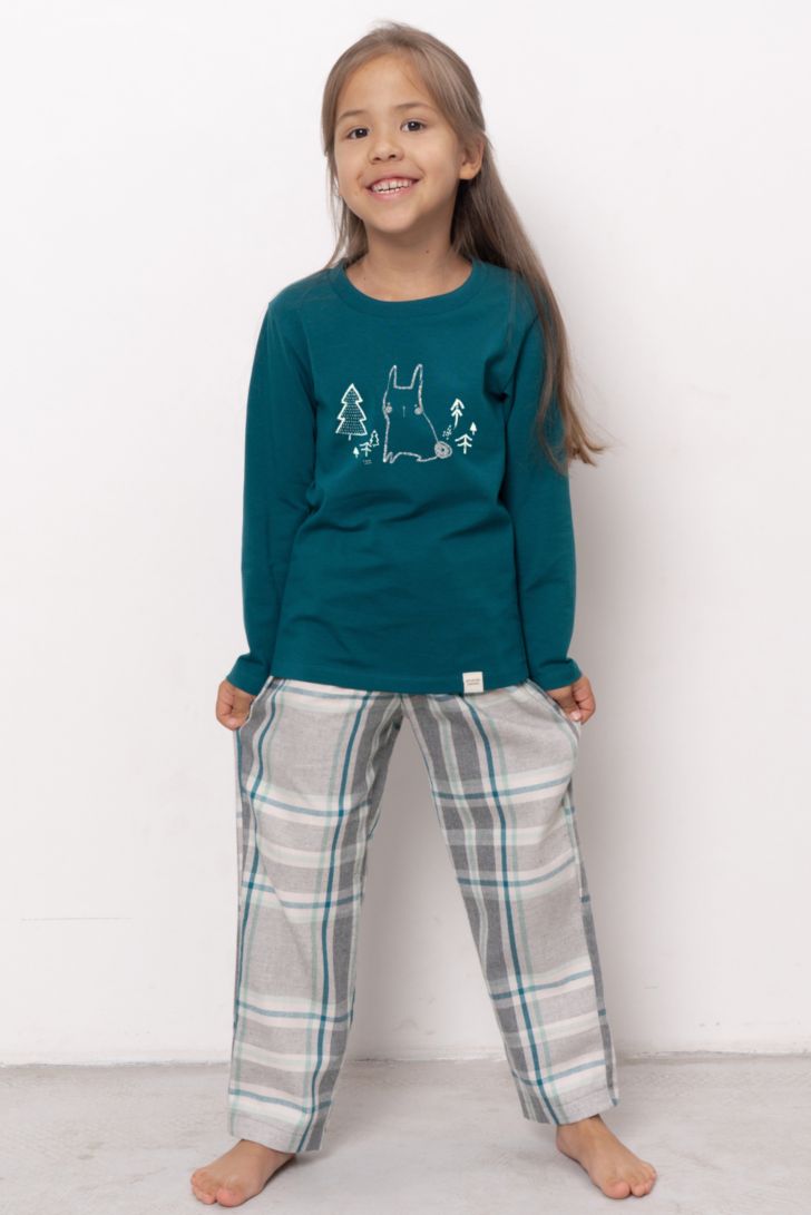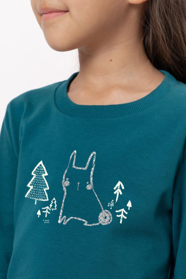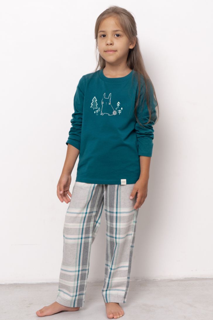 Детский комплект состоит из джемпера с длинным рукавом, декорированной тематическим принтом, и брюк свободного прилегания.