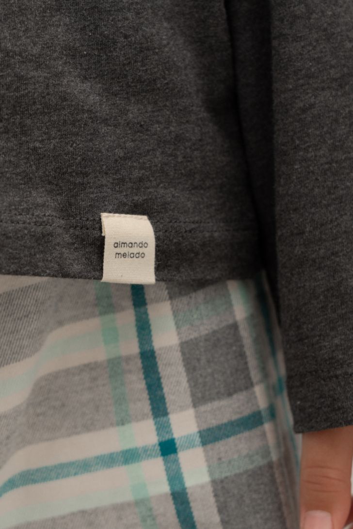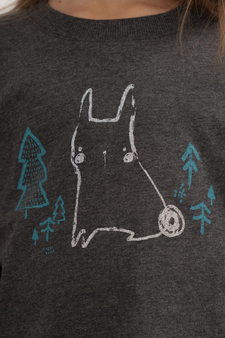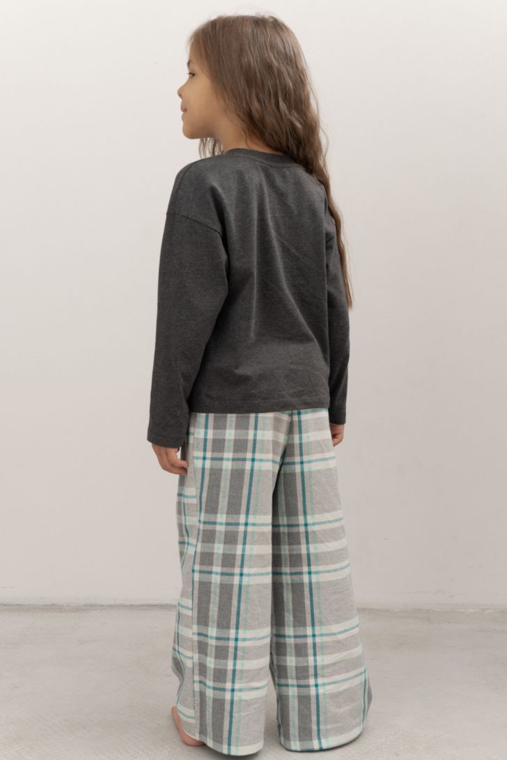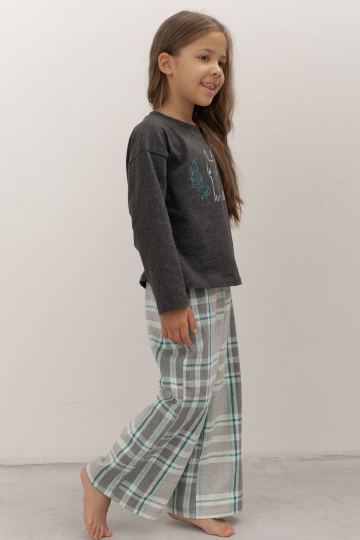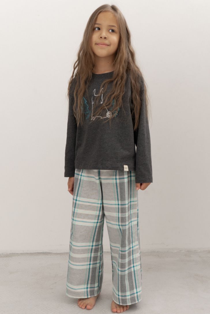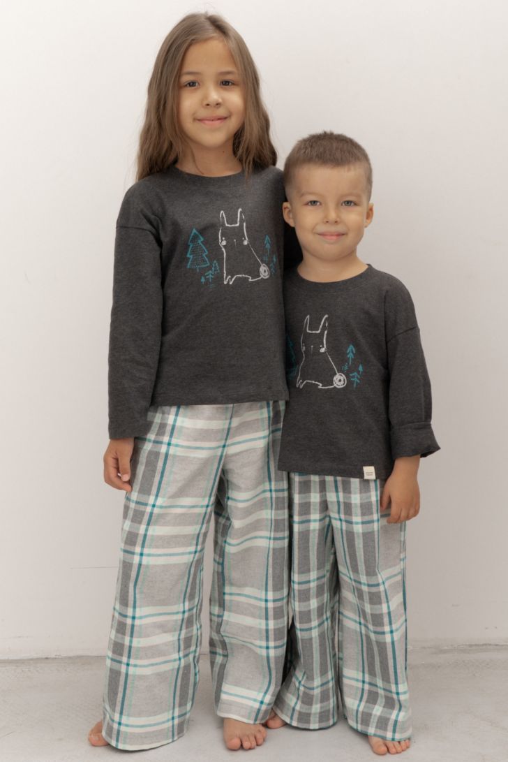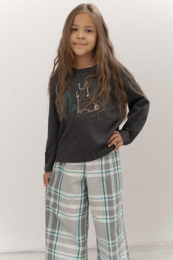 Детский комплект состоит из джемпера с длинным рукавом, декорированной тематическим принтом, и брюк свободного прилегания.