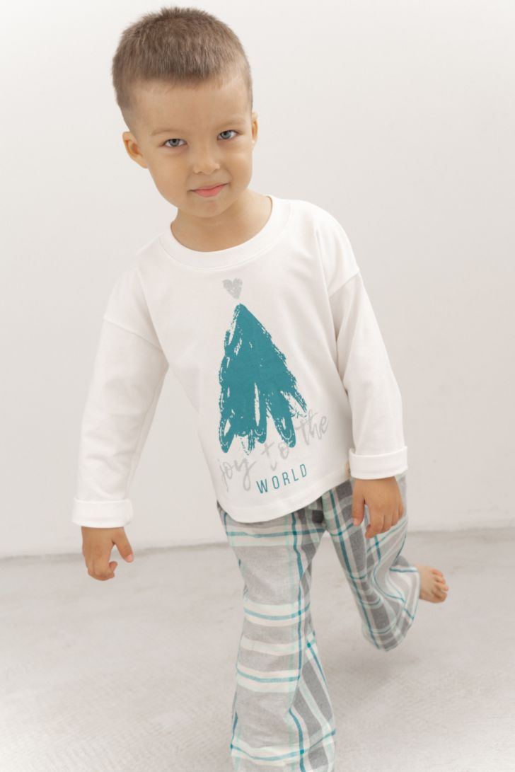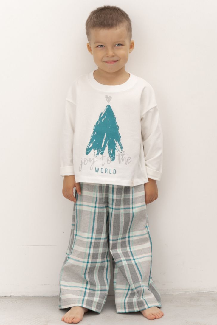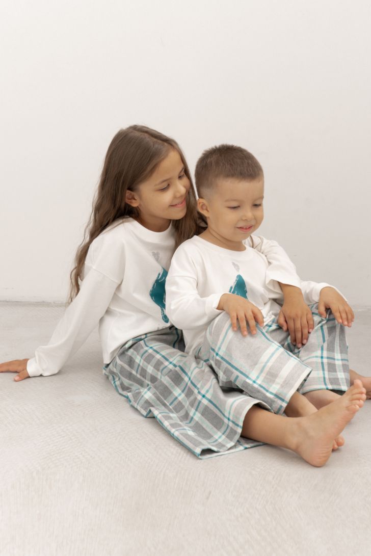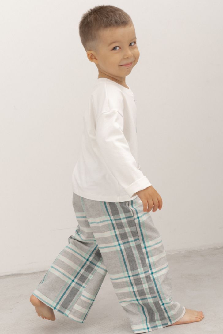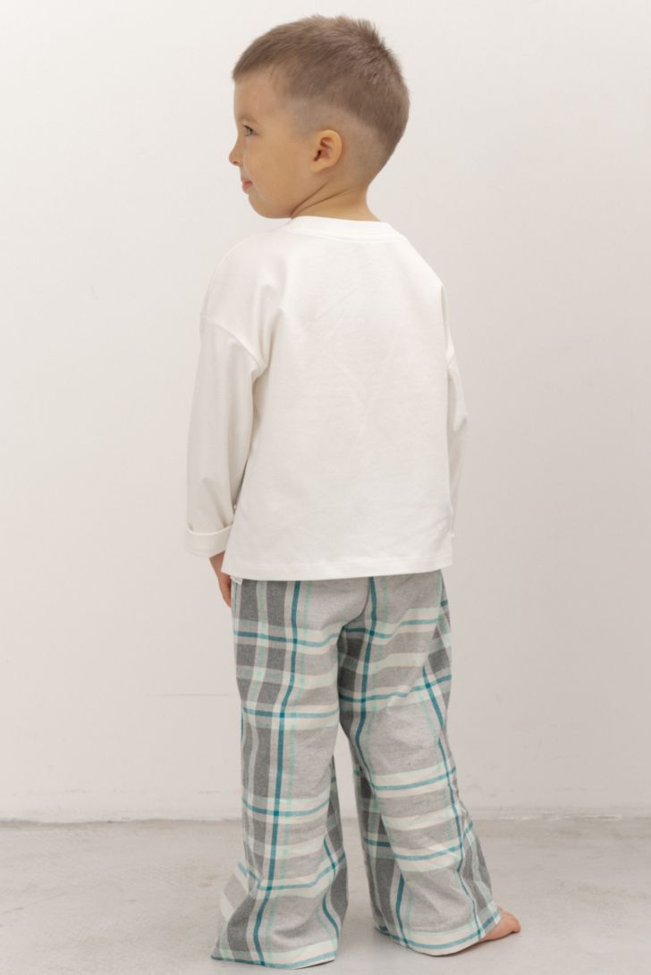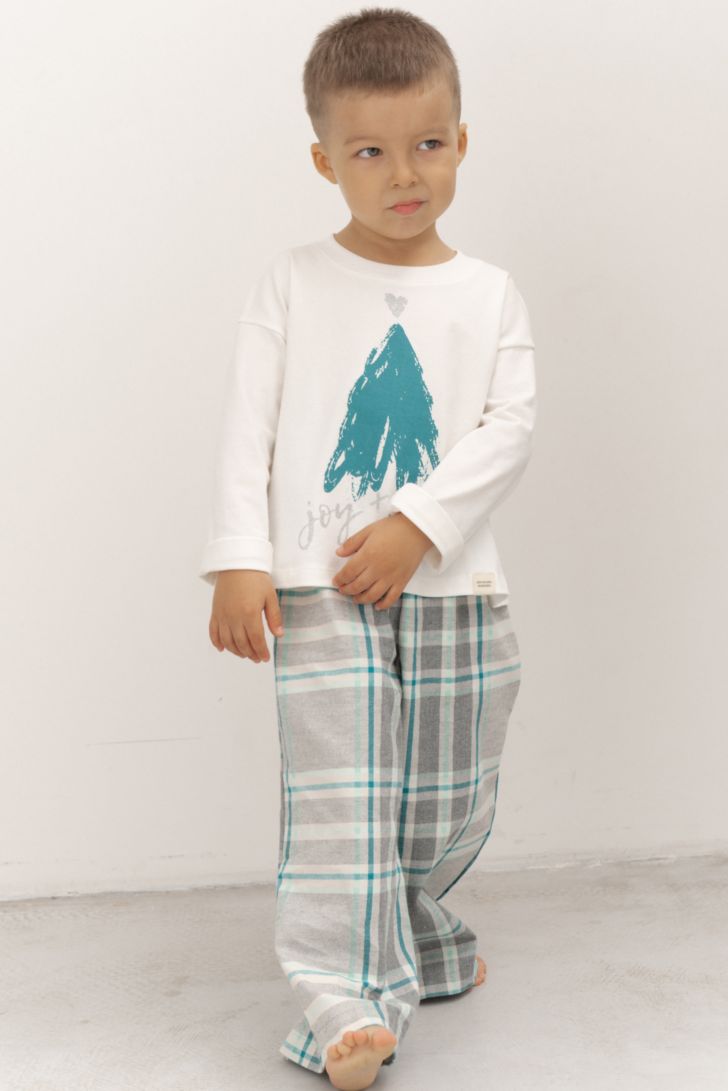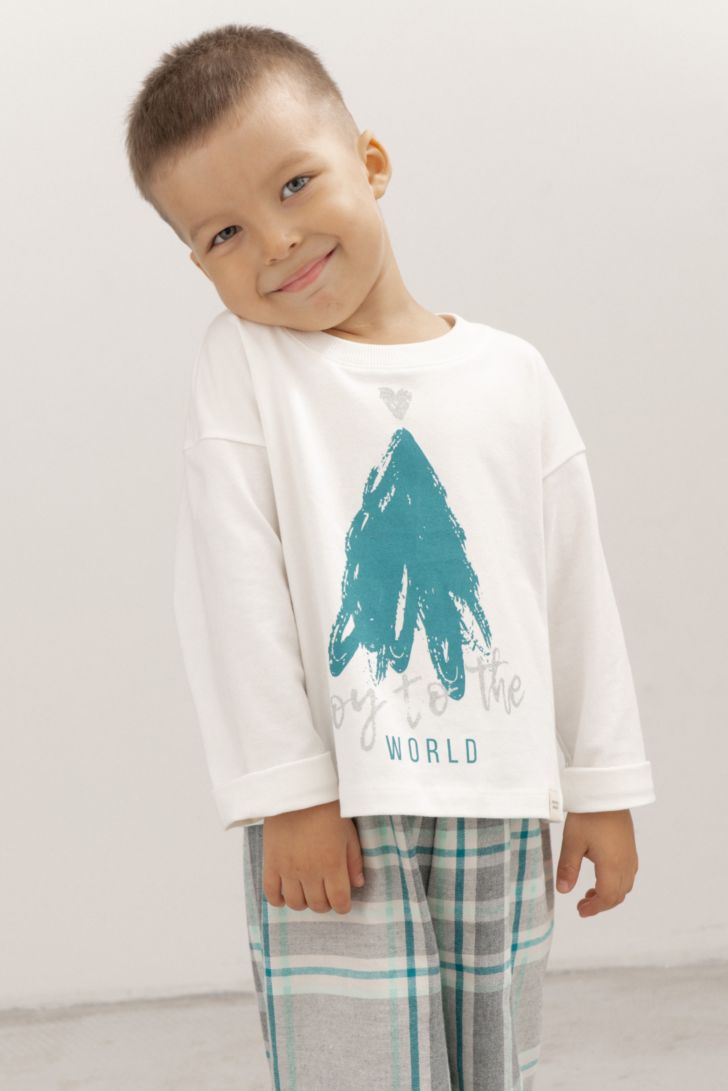 Детский комплект состоит из джемпера с длинным рукавом, декорированной тематическим принтом, и брюк свободного прилегания.