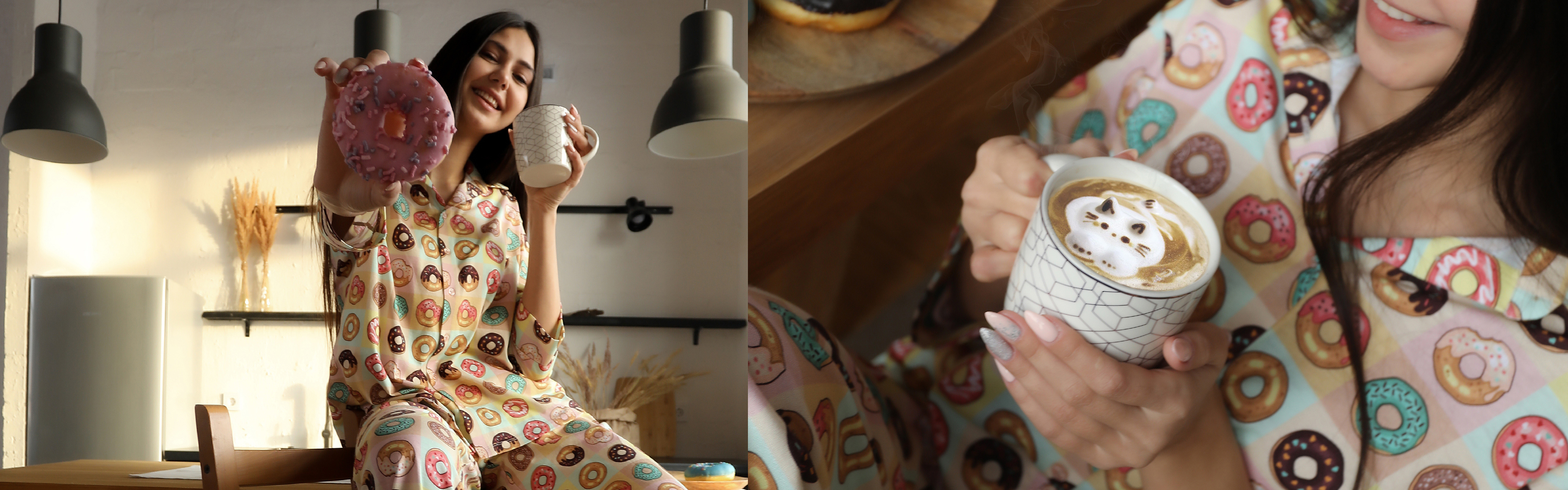Яркая, с веселым принтом, коллекция Donuts не оставит равнодушными любительниц домашней моды. Свободный крой, высокая тактильность полотна, оригинальные модели на любой вкус и тип фигуры – все это в новой коллекции из хлопка с эластаном – Donuts.